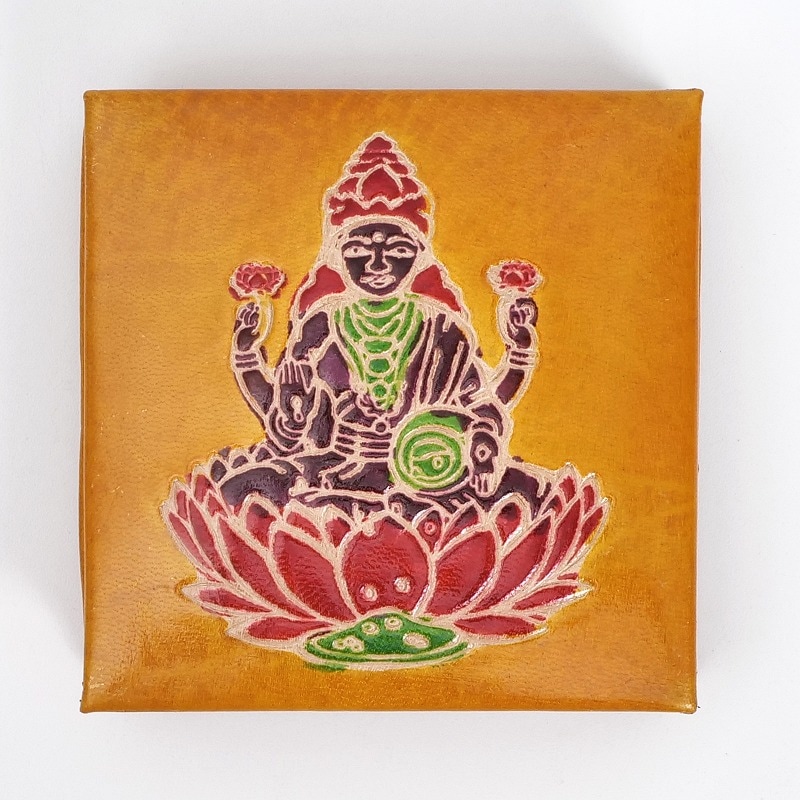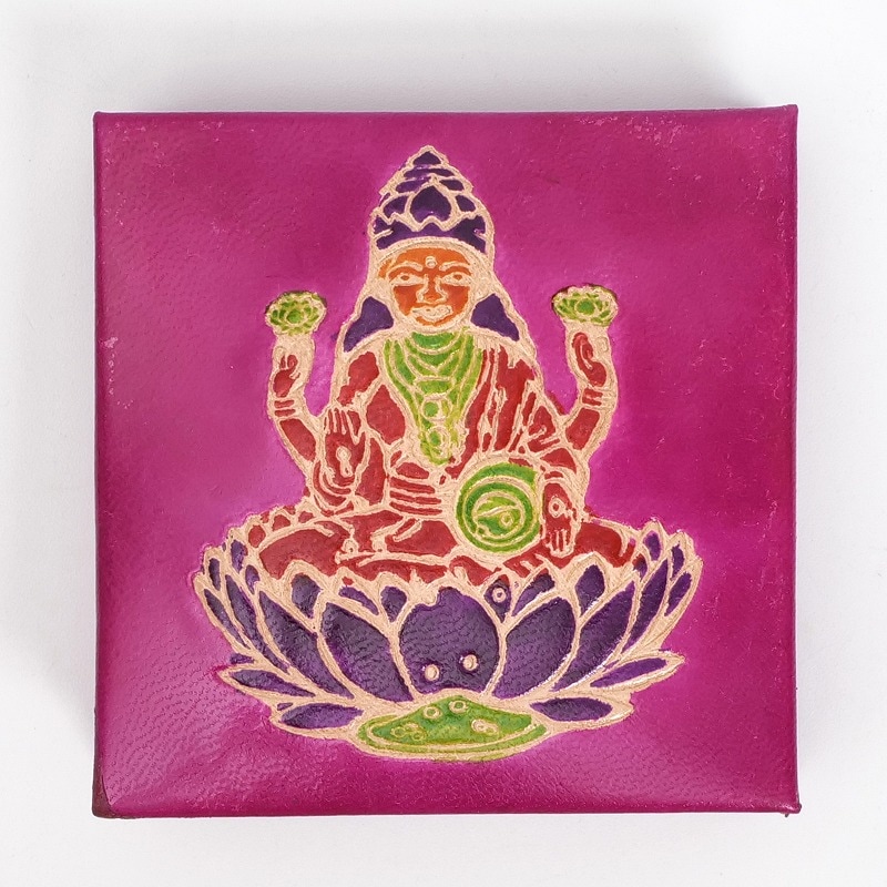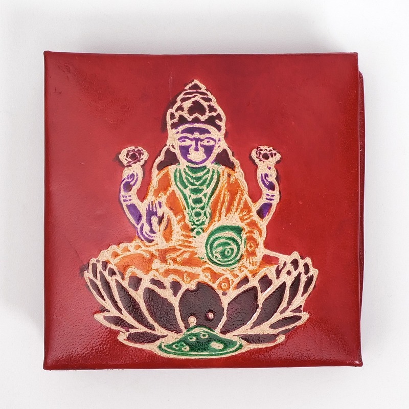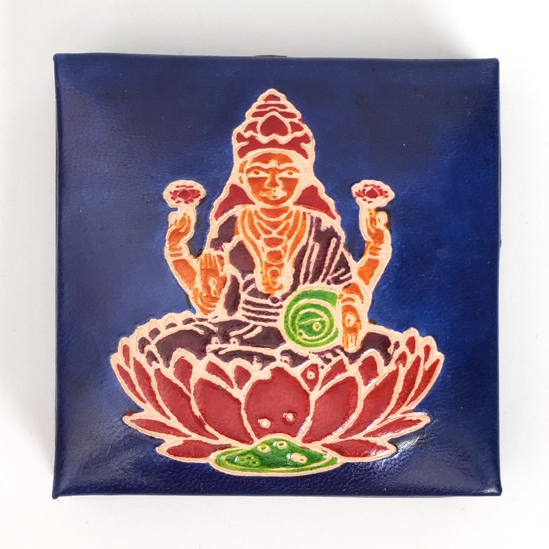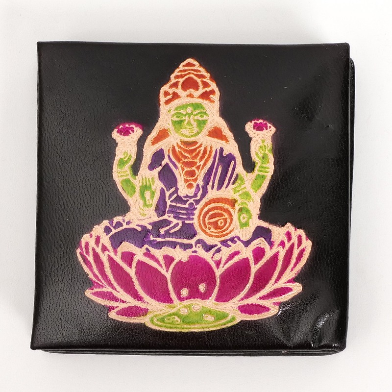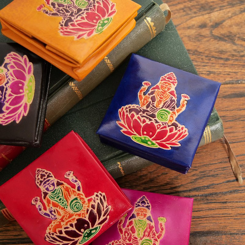 ラクシュミ神をモチーフにした定番のボックス型コインパース。ラクシュミーとは美と富と豊穣と幸運を司る神様。手や壺から金貨が溢れ出ている様子で描かれます。お守りのように持っていたくなる小銭入れです。