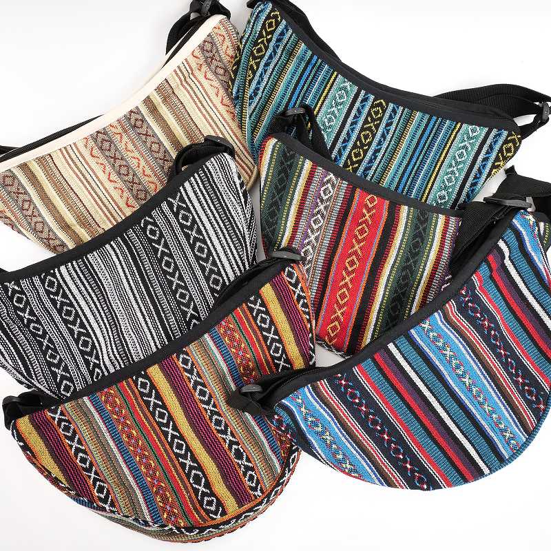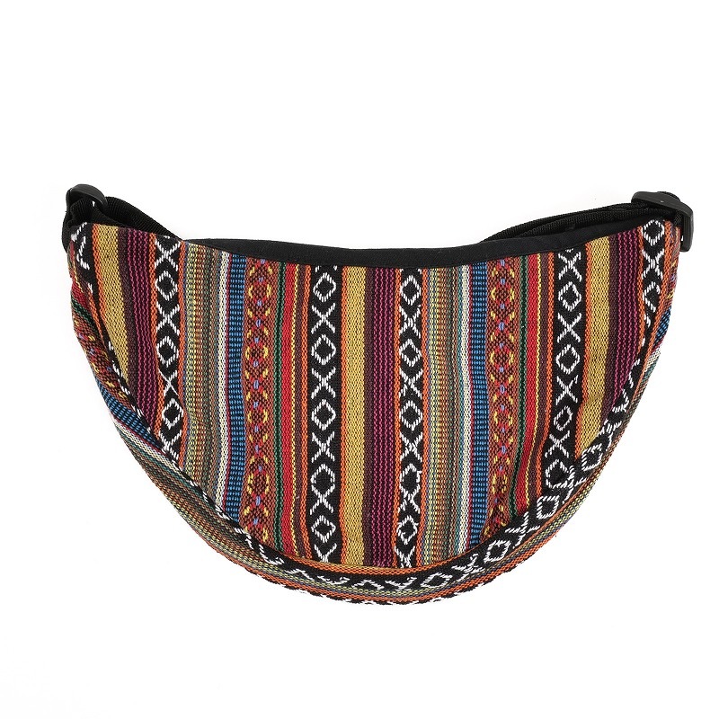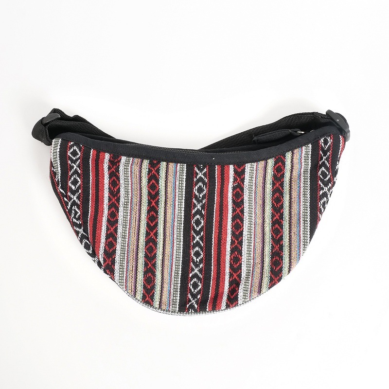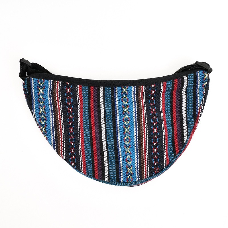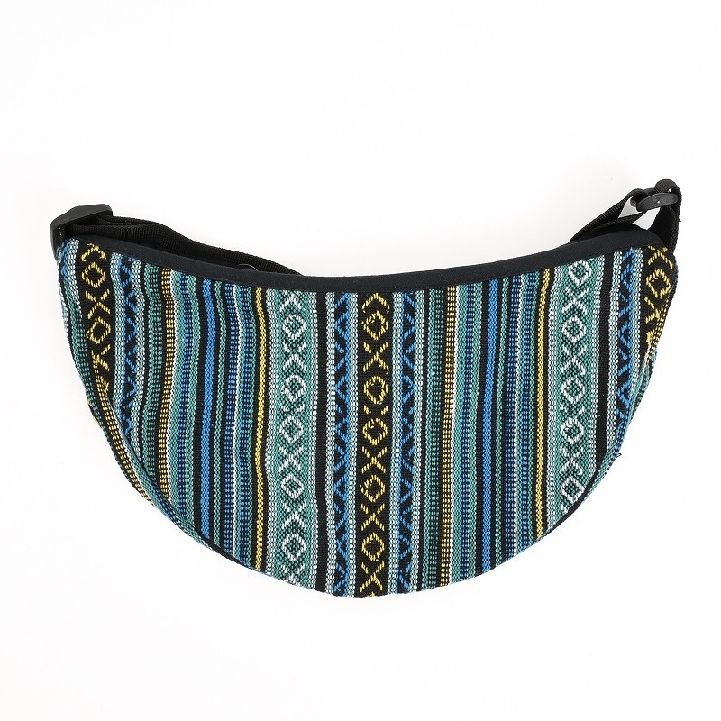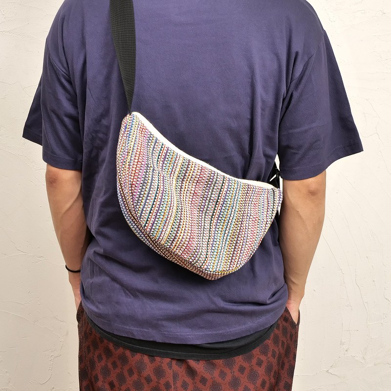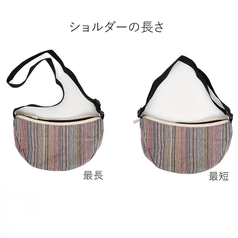 エスニック定番ゲレ生地の半月型ショルダーバッグ。ショルダー部分の長さは調整可能なので、肩掛けや斜め掛けなどいろんなスタイルが楽しめます。普段のお出かけ以外にも旅行のサブバッグとして、様々な場面で活躍しそう。500mlのペットボトルも入るサイズ。内ポケットが贅沢に2つ付いているのも嬉しいポイント。