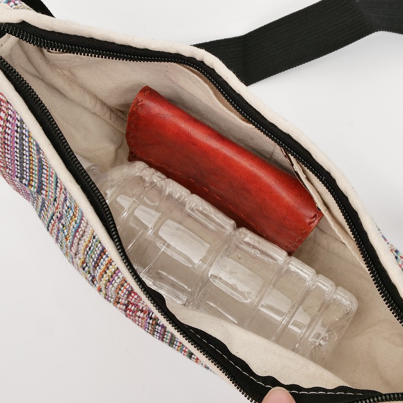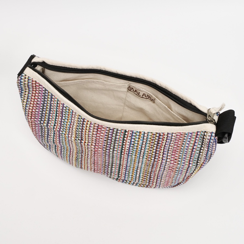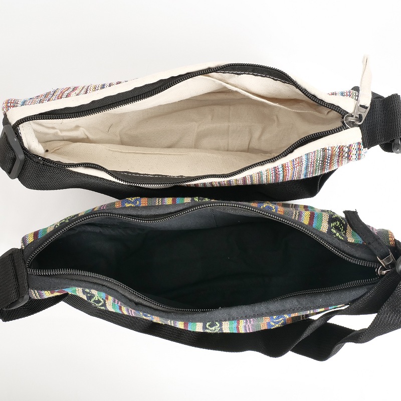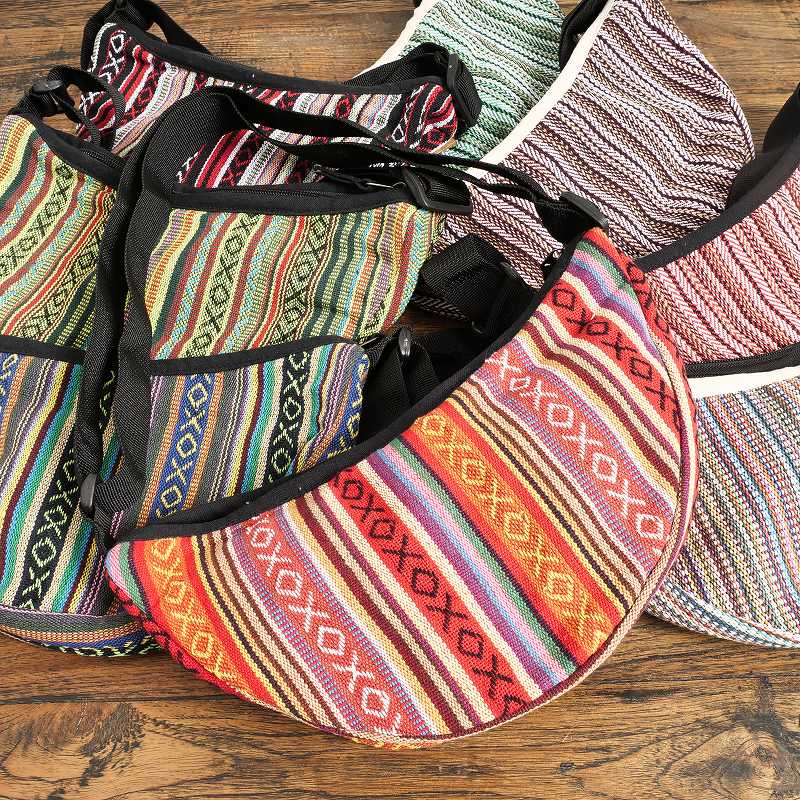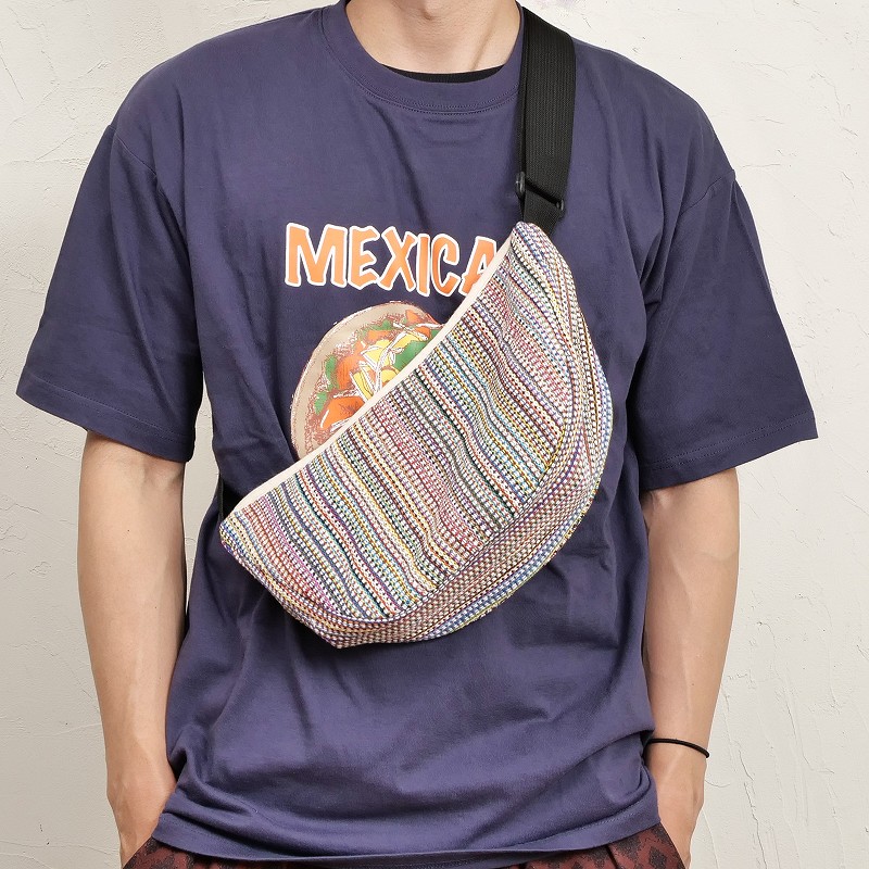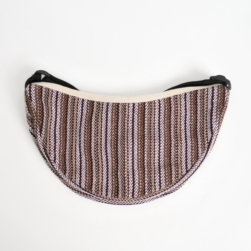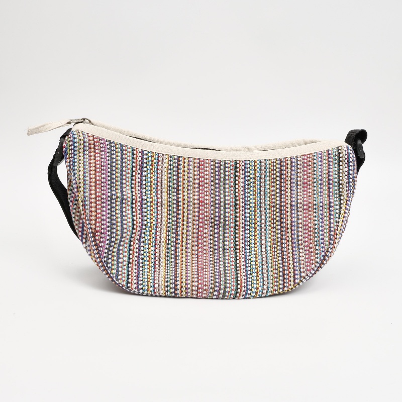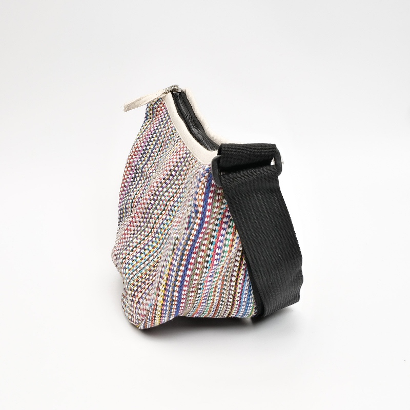 エスニック定番ゲレ生地の半月型ショルダーバッグ。ショルダー部分の長さは調整可能なので、肩掛けや斜め掛けなどいろんなスタイルが楽しめます。普段のお出かけ以外にも旅行のサブバッグとして、様々な場面で活躍しそう。500mlのペットボトルも入るサイズ。内ポケットが贅沢に2つ付いているのも嬉しいポイント。