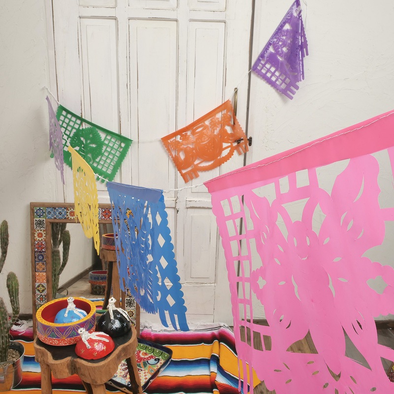 メキシコの伝統的な切り絵細工「パペルピカド」。”Papel picado”とは「穴あきの紙」の意味で、メキシコでのお祭りや休日は街中や室内などあらゆる場所がこのカラフルな飾りで彩られます。カラフルで軽く価格も手ごろ、インテリアやアウトドアのハッピーな飾りとして気軽に取り入れられる可愛いメキシコ雑貨です。