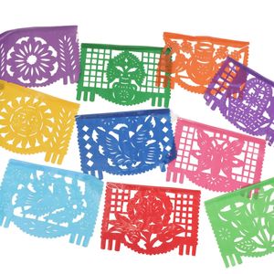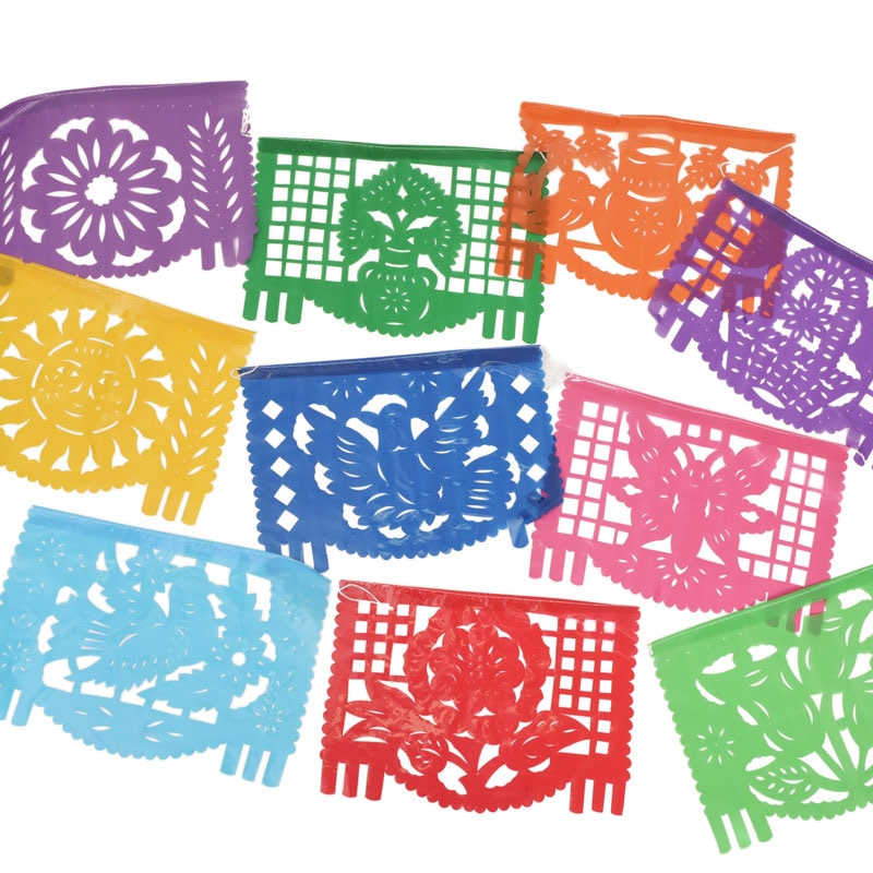 メキシコのフェスティバルには欠かせない伝統的な切り絵細工。スペイン語では「刻まれた紙」という意味で、もとは中国の切り絵から生まれたそう。天井にたくさんつけるのがメキシコ流。カラフルなパぺルピカドが青空によく映えます。パーティやイベントで飾るとパッと華やかに。ビニールタイプなので屋外や雨の日でも安心。