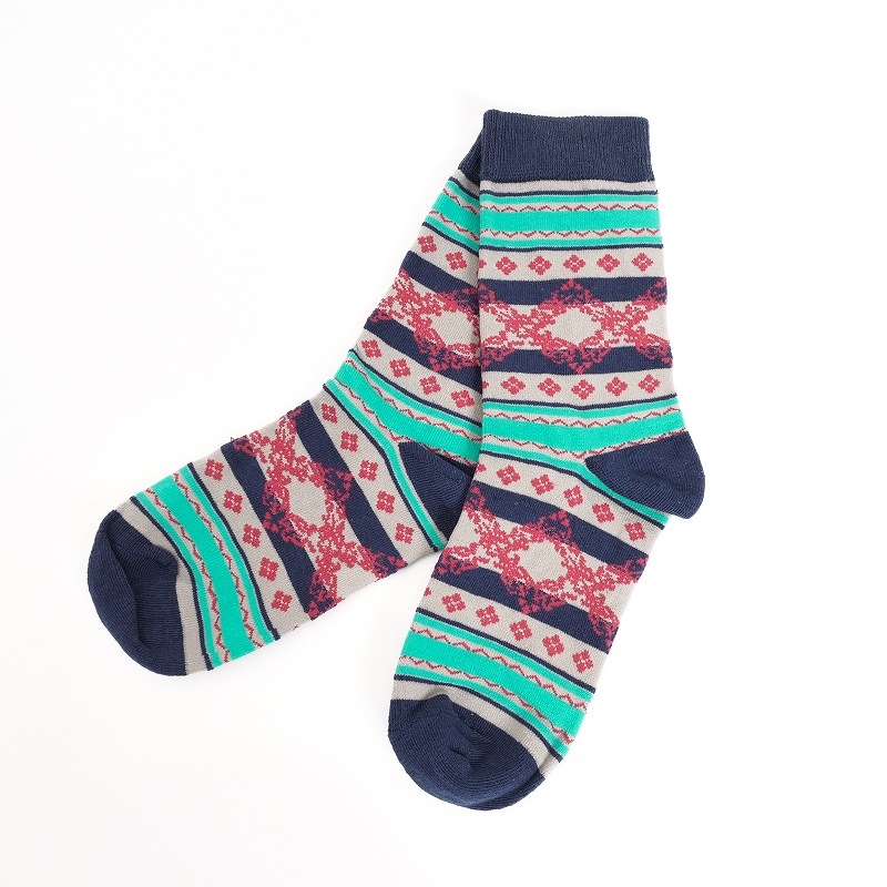 マライカオリジナルデザインのクルー丈ソックス。幾何学模様とボーダーを組み合わせたデザイン。クルー丈でシューズやショートブーツとの相性抜群です。