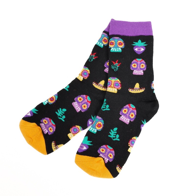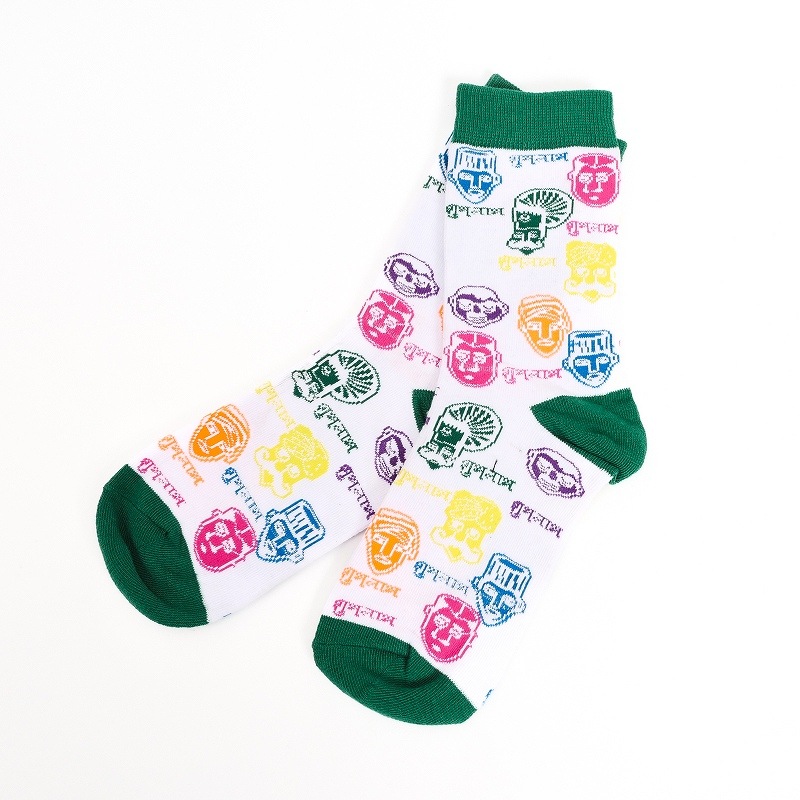 マライカオリジナルデザインのクルー丈ソックス。メキシコのカラベラ(ガイコツ)柄とインドのおじさん柄の2種類。おじさん柄にはヒンデイー語で「シュブラブ:幸運を祈る」と書かれています。クルー丈でシューズやショートブーツとの相性抜群です。