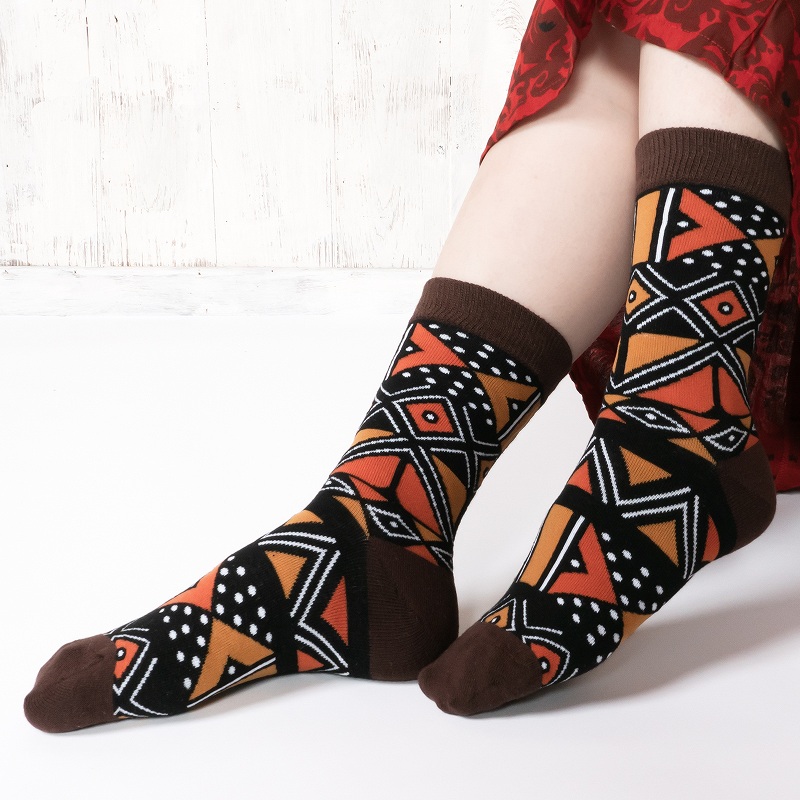 マライカオリジナルデザインのクルー丈ソックス。アフリカの泥染め布がモチーフ。クルー丈でシューズやショートブーツとの相性抜群です。