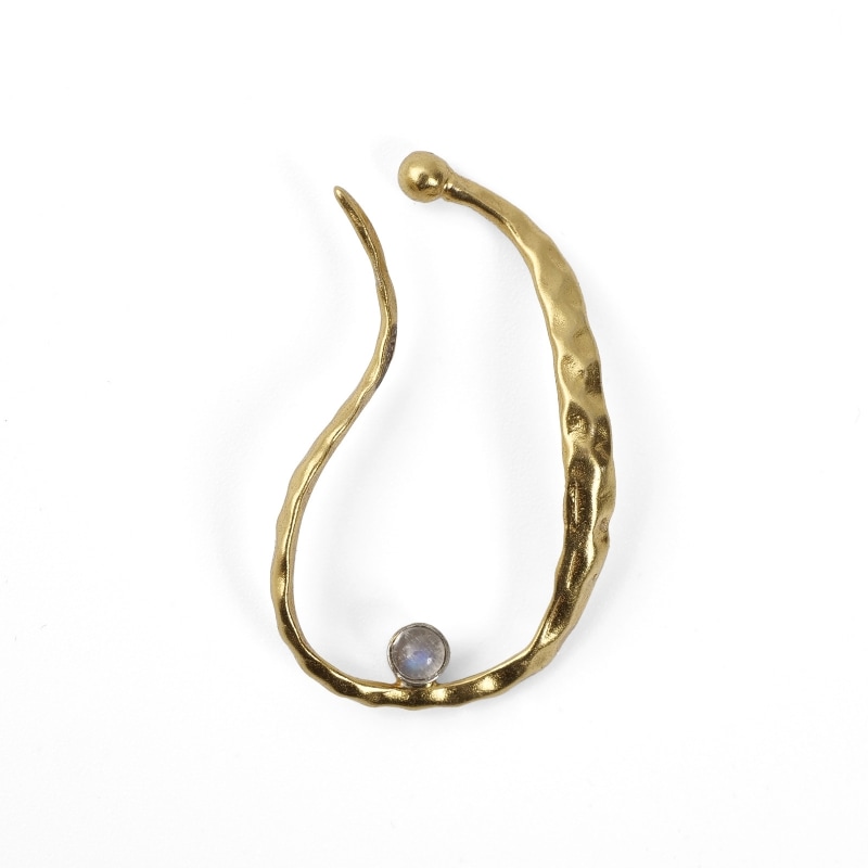 トップパーツのレインボームーンストーンは「幸運を呼び込む」と言い伝えられています。ナチュラルな雰囲気の曲線が特徴的な、シンプルなデザインのイヤーカフはどんなコーデにも相性抜群。着用の際は優しく指で押さえるようにご調整ください。ピアスの穴がなくてもつけられるやさしいアクセサリーです。