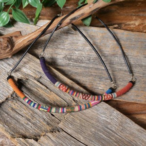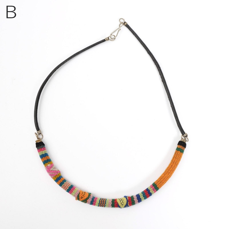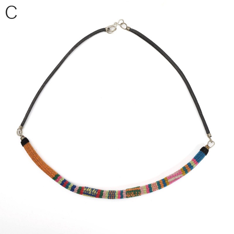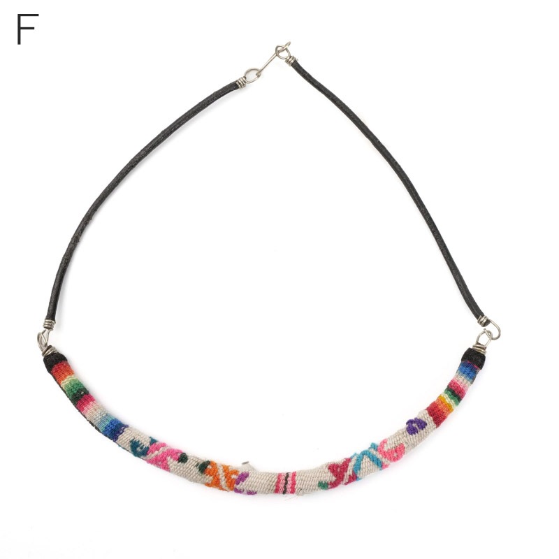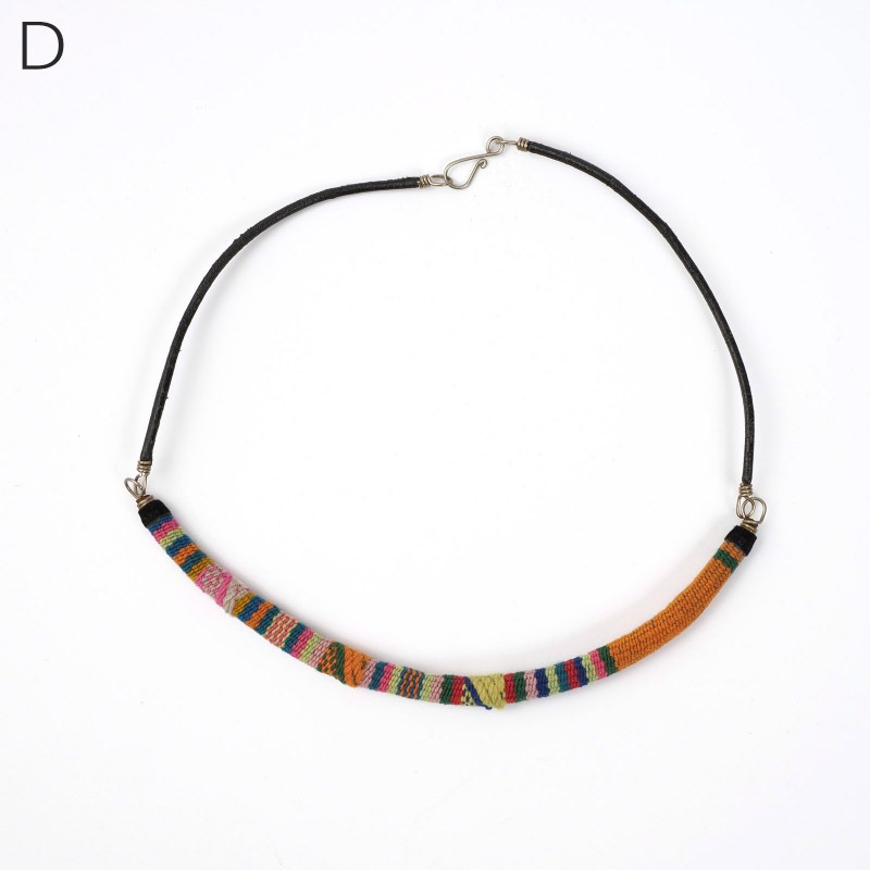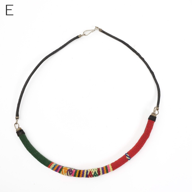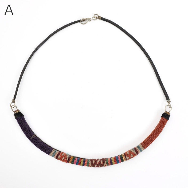 アンデス伝統の手織り物「マンタ」を使ったネックレス。一枚の布の継ぎ目を装飾・補強するように施される幾何学的な模様がシンプルなシルエットのネックレスで引き立ちます。