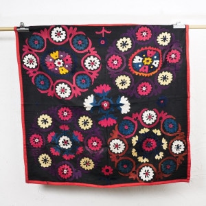 スザンニ(スザニ)は、中央アジアの遊牧民に伝わる刺繍を施した布のことで、ウズベキスタンがその発祥地と言われ、ウズベキスタン、タジキスタン、カザフスタンなどの国々で広く伝わる伝統技法です。ウズベク語で「刺繍」を意味し、その語源はペルシア語で「針」を示す「スザン」に由来すると言われています。刺繍には花や植物をモチーフにしたものが多く、各家庭で作られ、主に壁掛けやベッドカバー、座布団などに使われてきました。長い時間をかけて施されたびっしりと密な刺繍と、それらモチーフの重厚な立体感、中央アジアならではの美しい配色や繊細なモチーフの配置が魅力です。