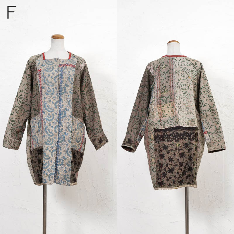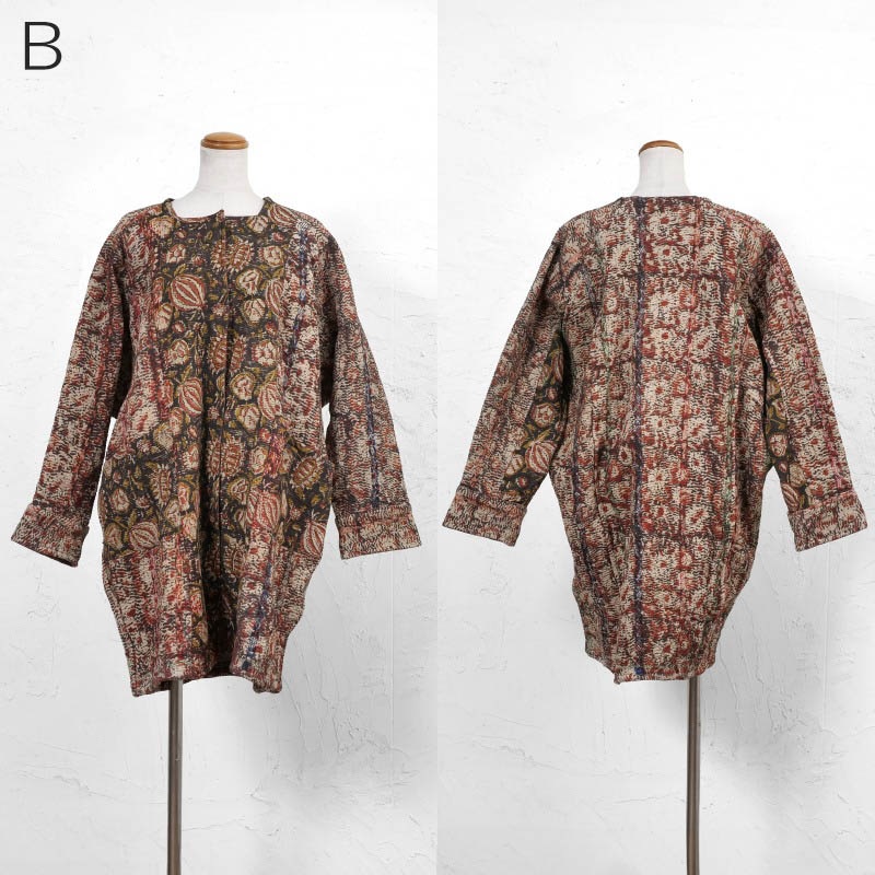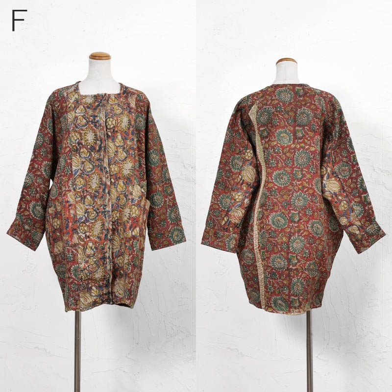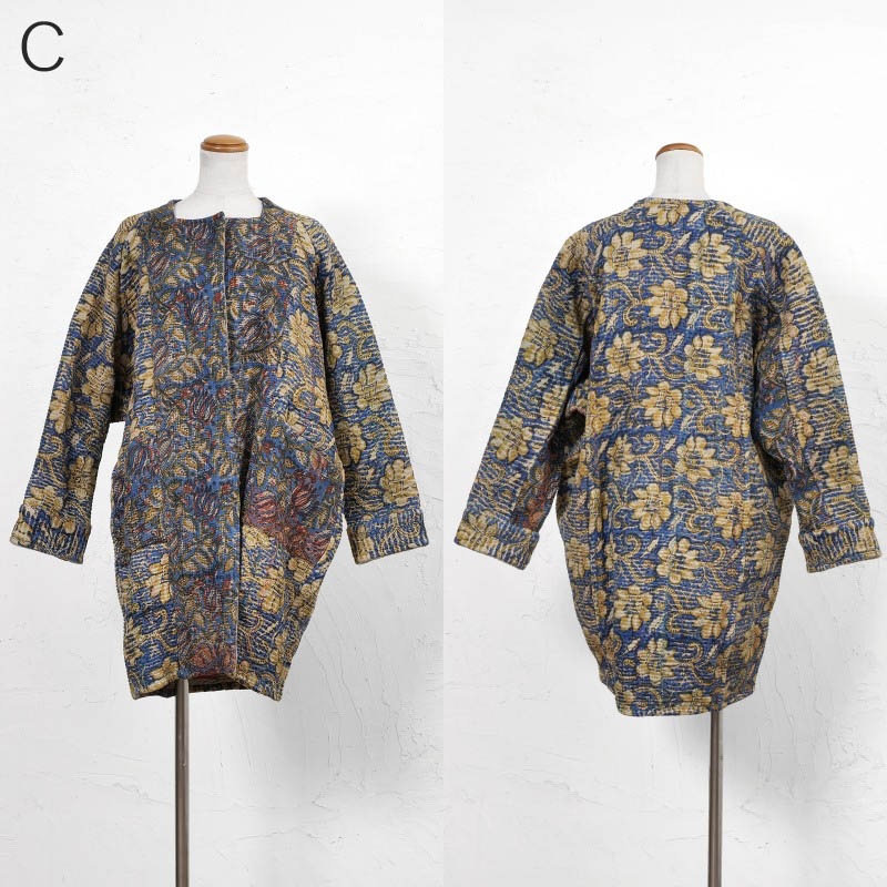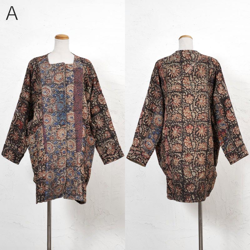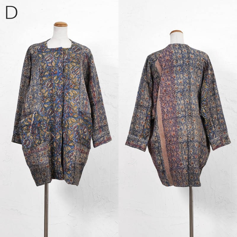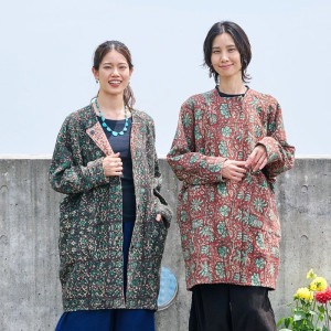 オールドグドゥリーの上にインド・バグルー地方のブロックプリントを施した生地を使用したコート。リバーシブルで着ることができ、1枚でそれぞれ異なる印象に。ボトムスタイルともコーディネートしやすいミディー丈のアウター。バグループリントは深みのある天然染料による捺染のため、より一層奥行きが感じられる特別な仕上がりに。生地やプリントの組み合わせは一つ一つ異なる1点ものです。
