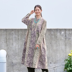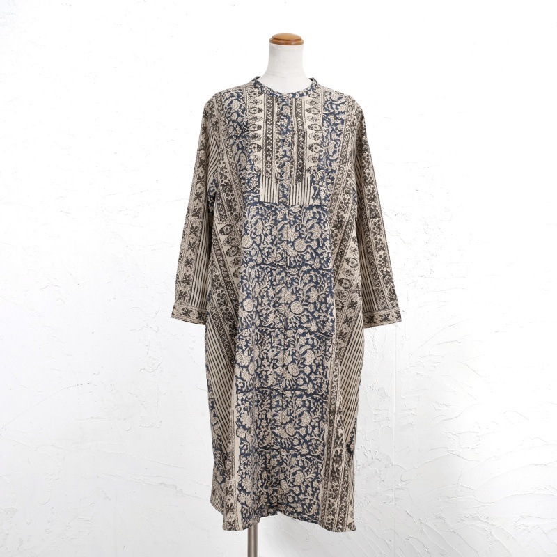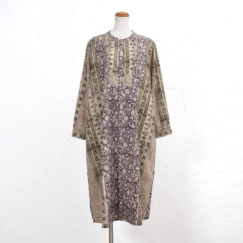 花柄やストライプなど異なる柄を組み合わせてプリントした前あきワンピース。パッチワークのような印象。シンプルなロングシャツデザインなので、羽織りとしても着こなせるアイテム。藍やターメリックといった天然の染料のみを使用したやさしい色合いも魅力。