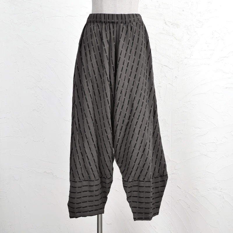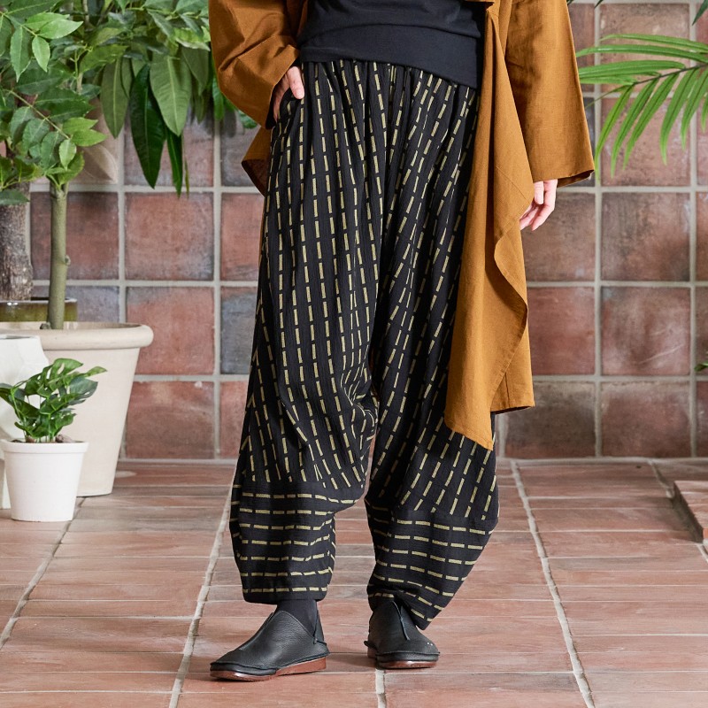 ゆったりとしたコクーンシルエットのパンツ。柄を生かした裾の切り替えがポイント。ざっくり織られたシャリ感のある柔らかなコットン素材で心地良く着ていただけます。