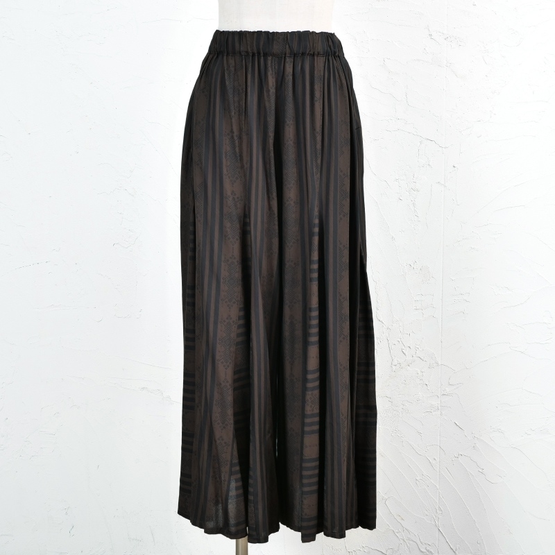 シックな色味で落ち着いた雰囲気のある総柄パンツ。ゆったりとしたワイドなシルエットのパンツは、トップスをコンパクトにまとめるとバランス良いスタイリングに。ボリュームがありながら、落ち感のある生地ですっきり着こなせるアイテム。