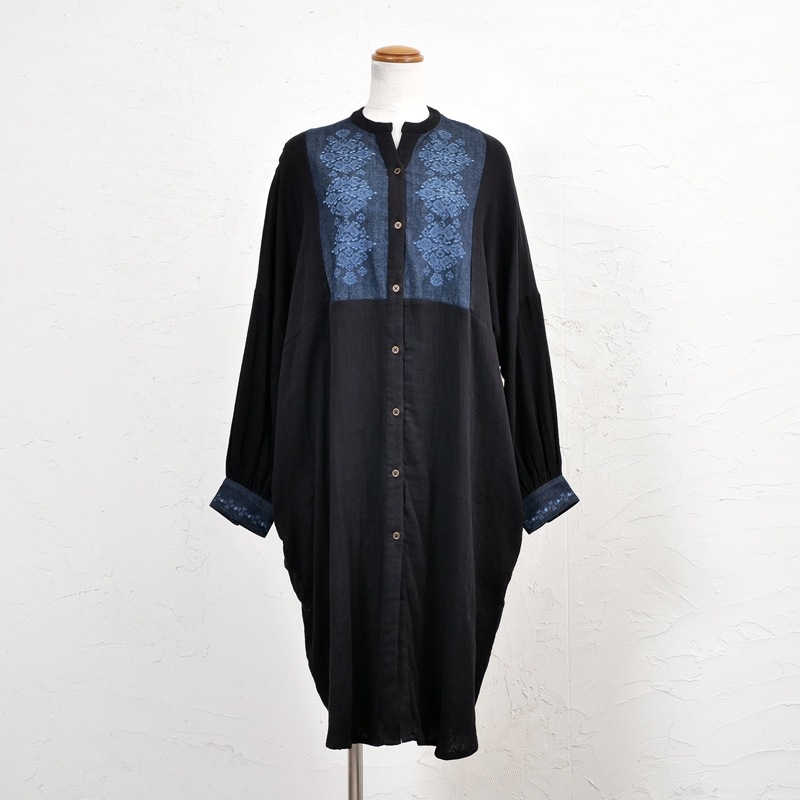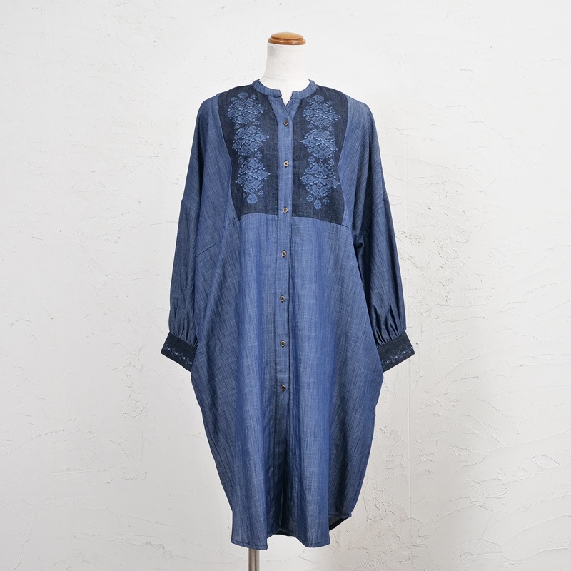 前後と袖口にデニムを使用し、異素材を組み合わせた前あきワンピース。デニム生地にブリーチプリントとダメージ加工で模様を付けた変わり種アイテム。ゆったりしたシルエットでリラックス感のあるカジュアルデザイン。シャンブレーとガーゼ、お好きな組み合わせを選べます。