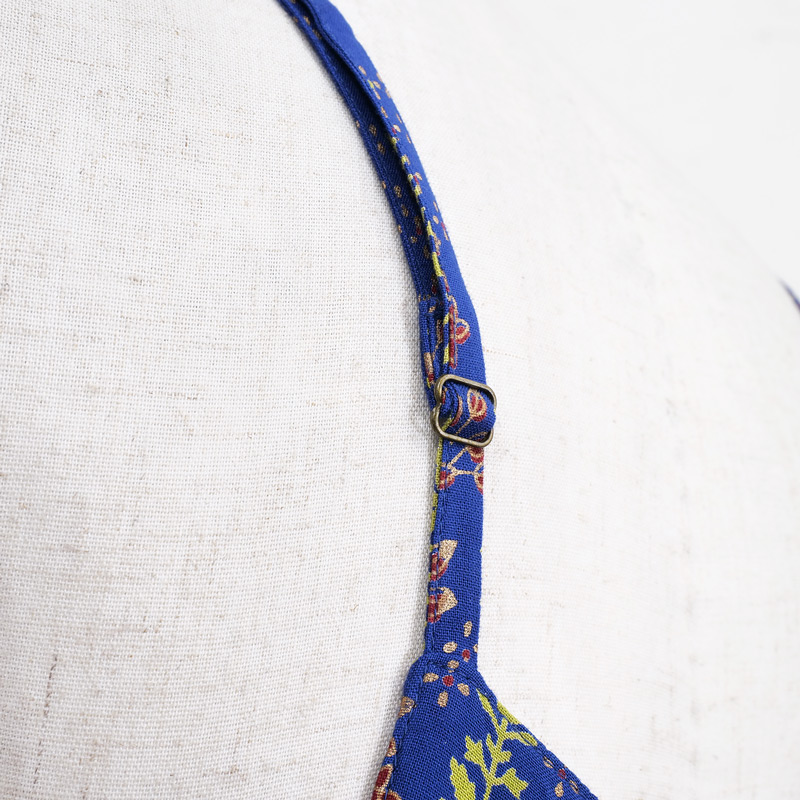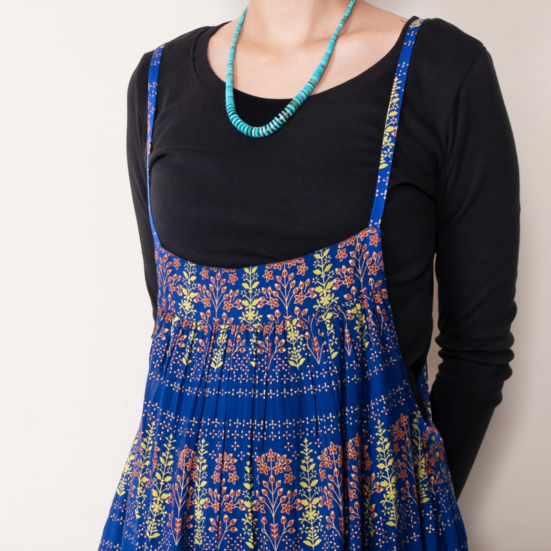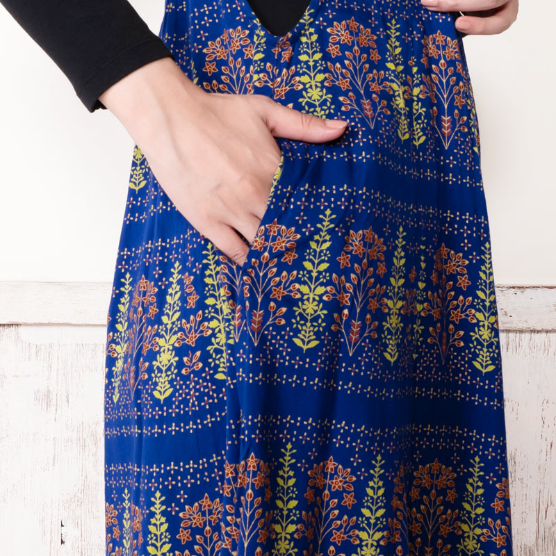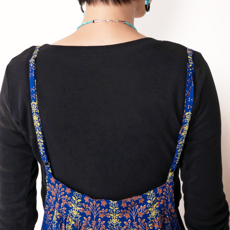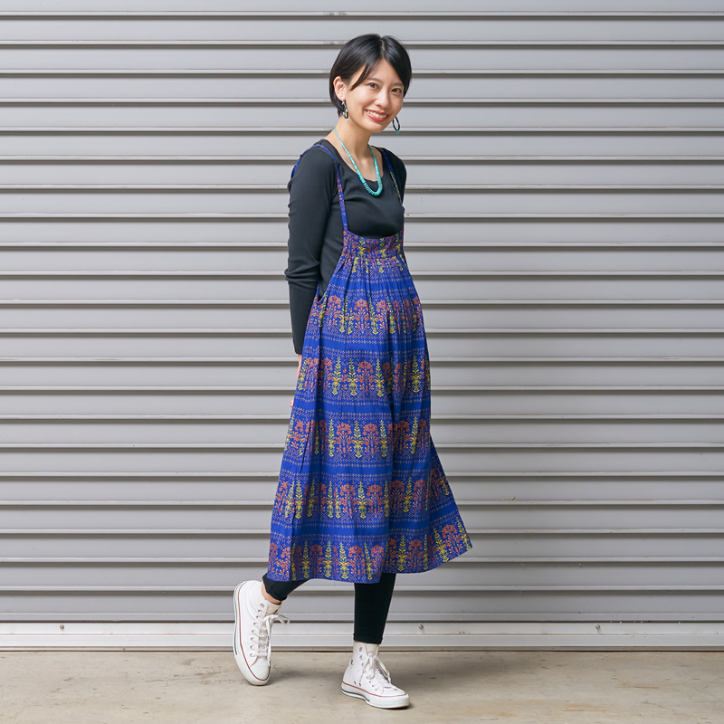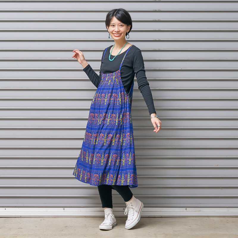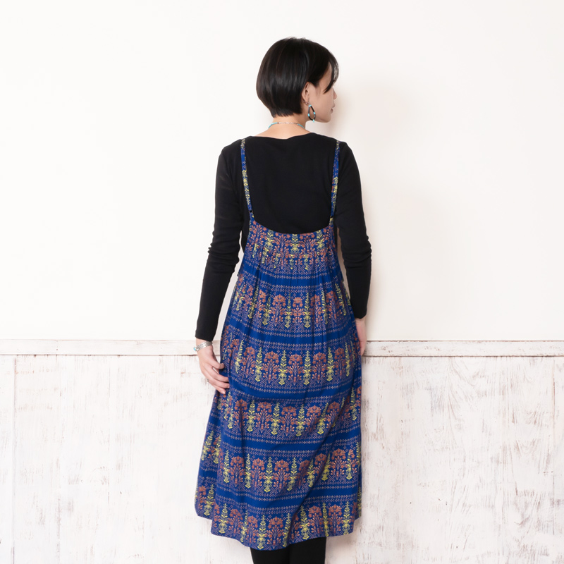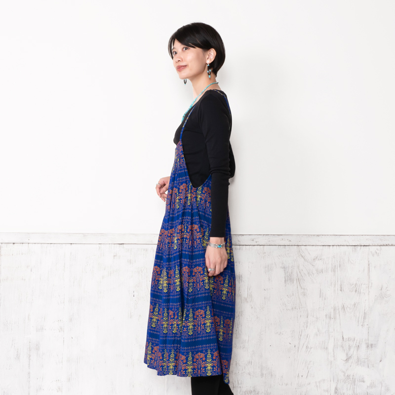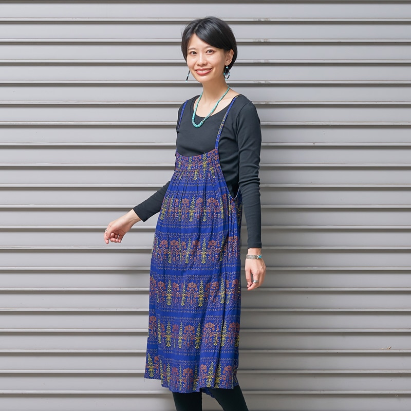 シンプルなデザインのキャミワンピース。ブラックやブルーに映えるゴールドプリントが華やかさをプラスし、エキゾチックなエスニックな魅力を感じさせる。シンプルな無地のアイテムを合わせた着こなしがおすすめ。肩ひもの長さはお好みで変えられます。