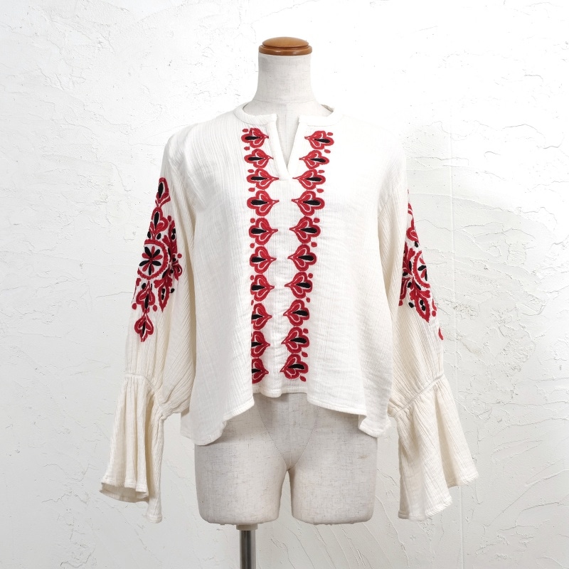 くしゅっとした生地にオリエンタル刺繍を施したプルオーバー。ふんわりとしたボリューム袖の大きな刺繍が特徴。黒地にピーコックブルーの刺繍と白地にレッドの刺繍が映える。生地の風合いがよく、緩やかな抜け感のあるアイテム。総柄のボトムスを合わせた着こなしがおすすめ。