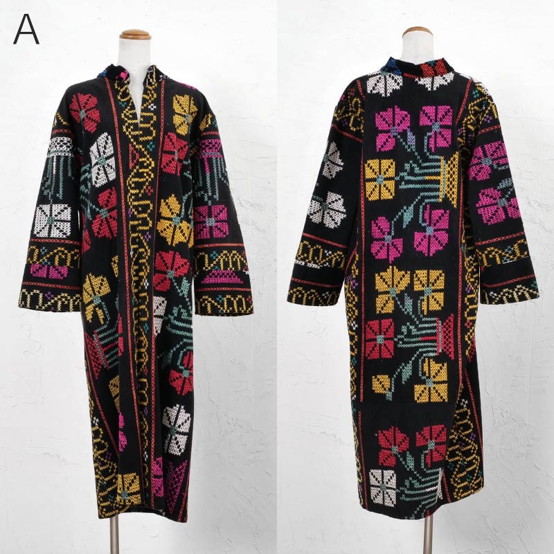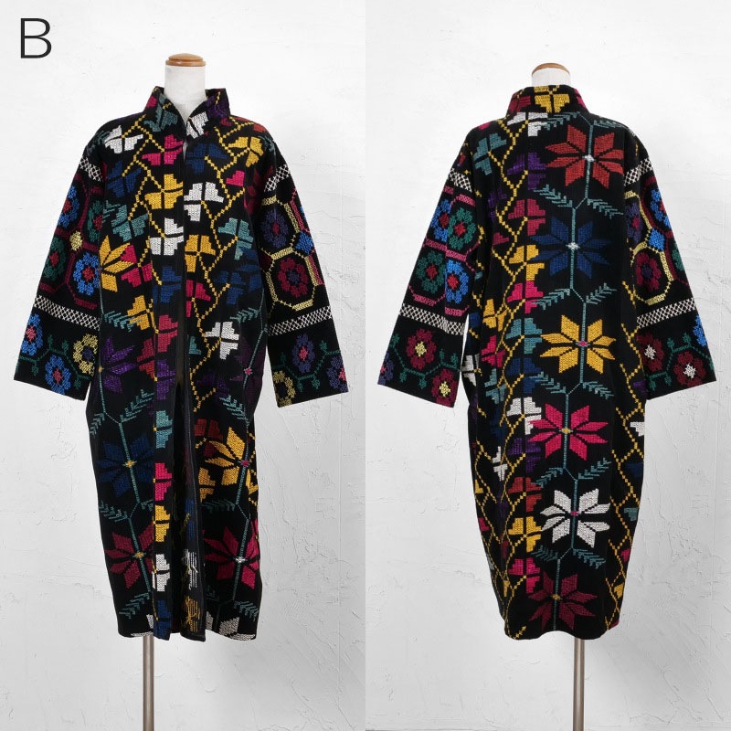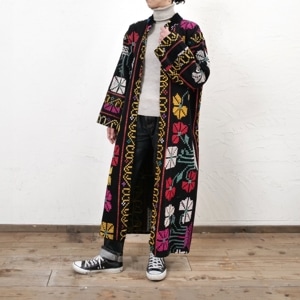 びっしりと施された刺繍と大胆な配色が印象的なスザニガウン。ブラックのコーデュロイ生地に、植物をモチーフにした鮮やかなクロスステッチ刺繍が施されています。オーバーサイズでさらりと羽織れる、軽い着心地が特徴的。