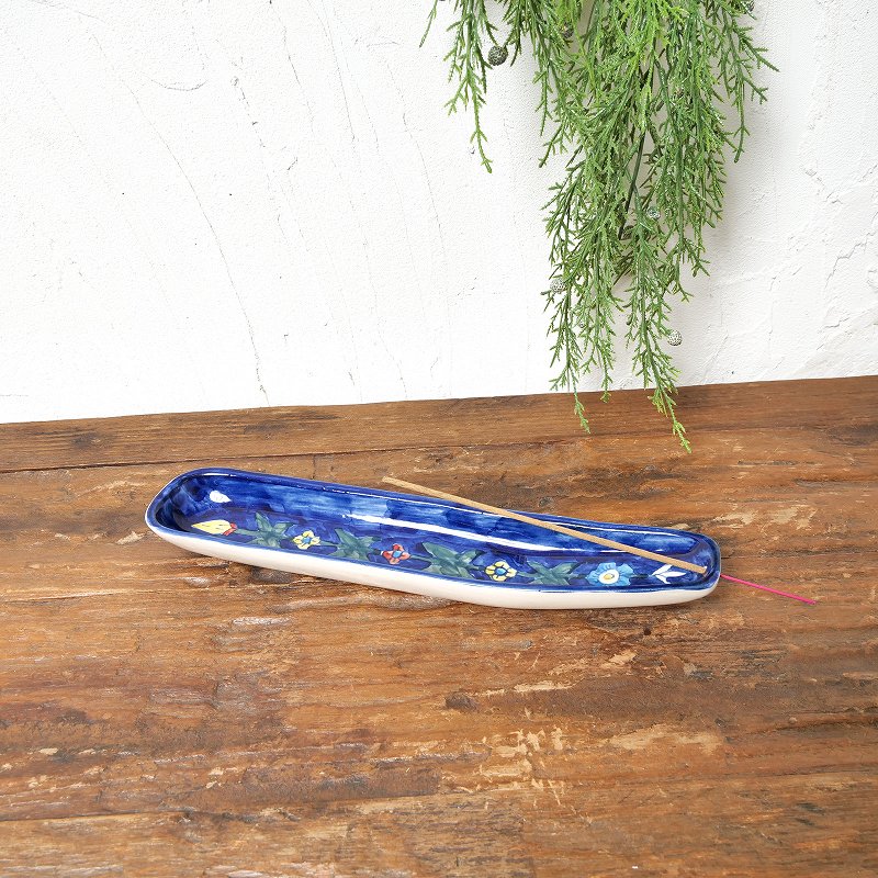インド・ジャイプールの伝統工芸品ブルーポタリの香立て。ハンドペイントの生き生きとしたタッチが癒しのひとときに華を添えてくれます。香立ての先に空いている穴にスティックタイプのお香を挿して使います。花柄が映える濃い青色です。