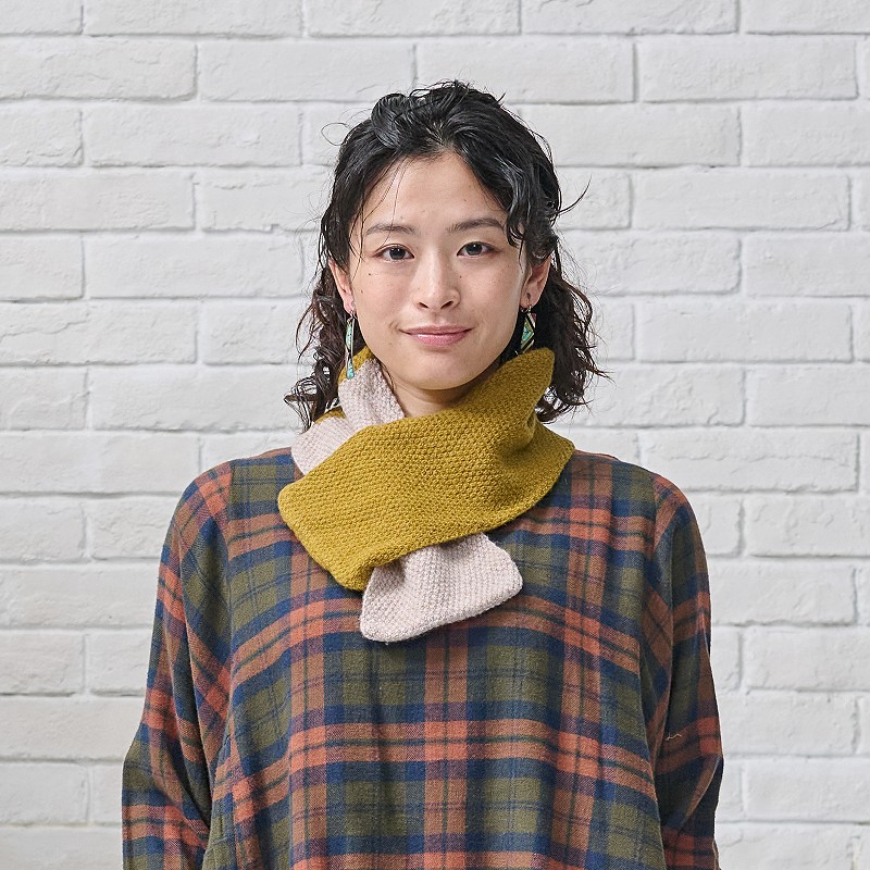 軽い付け心地のバイカラーミニストール。片方のループに反対側の端を通すだけで簡単に首に巻けます。両側にループがあるので、バイカラーの見せたい方の色を上にすることができます。滑らかな手触りでしっかり暖かく、持ち運びしやすいコンパクトさも嬉しいポイント。
