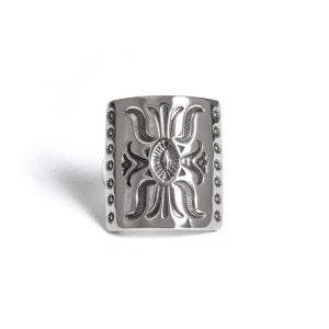 ジェニファーカーティススタンプワークリングです。トップには弓矢を使う時に腕につけるボウガードのデザイン、ナバホ語で『ケトー』と呼ばれるモチーフ。厚みのあるシルバーを鏡面に磨き上げ護符の意味を持つケトーを力強く表現、背面は細身に仕立てボリュームがありつつ手指の動きを妨げません。伝統的なモチーフながらソリッドで現代的なジェニファーらしいリングに仕上がっています。