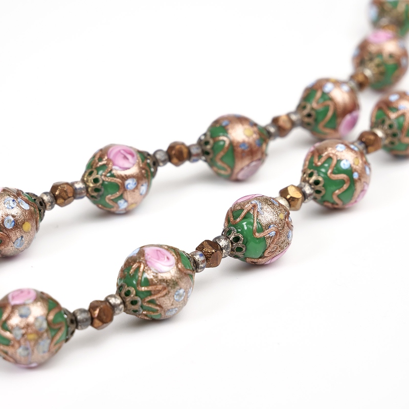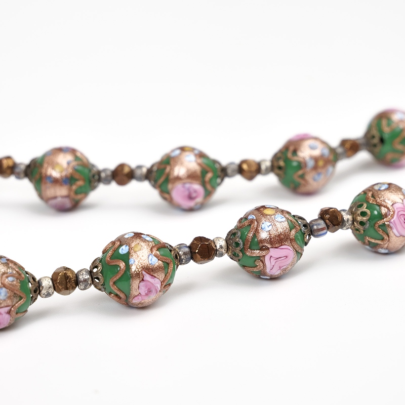 こちらのビクトリアンビーズは緑を基調にバラ模様のピンクが美しくデザインされています。温かみのあるオレンジ、さらにゴールドのアクセントが加わり、華やかさと落ち着きを兼ね備えた絶妙な配色です。それぞれのビーズには時を経て醸し出される独特の風合いがあり、ヴィンテージ感を楽しみたい方にぴったりです。身につけるだけで個性的で深みのある印象を引き立て、装いを特別なものにしてくれます。