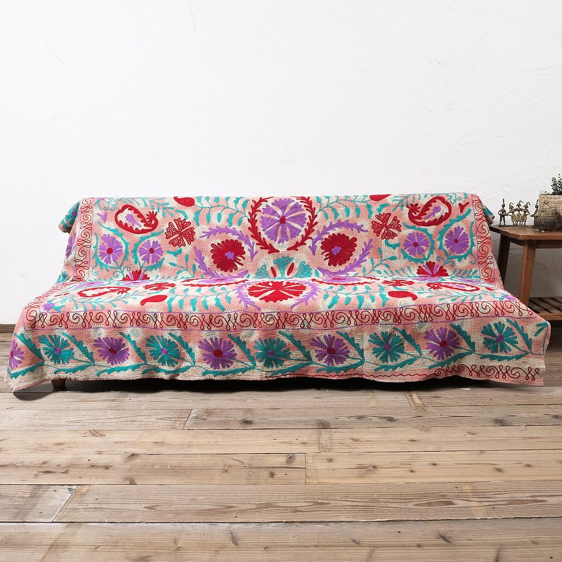 オールドサリーに刺し子を施した素朴な布に、中央アジア系の雰囲気があるアリ刺繍を重ねたスペシャルアイテム。お部屋の印象をガラっと変えてくれます。コットングドゥリー生地の柔らかな肌触りで、ソファーやベッドカバーにおすすめです。