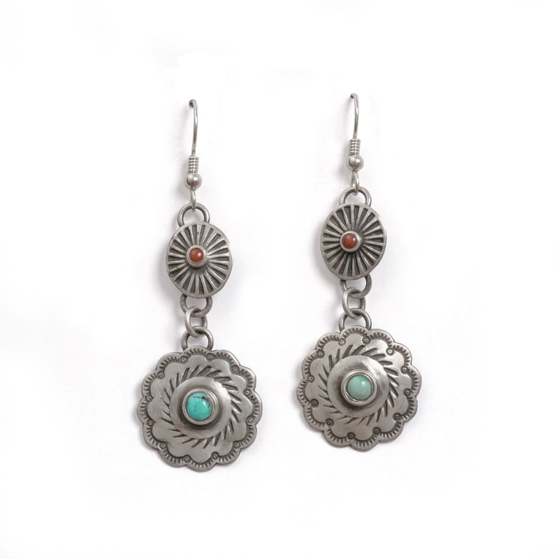 ファルコントレーディング(ファルコントレーディング)のハンドメイドピアスです。極小コーラルとハンドカットフォックスターコイズをコンチョ仕立てにし、ごく軽いピアスに仕立てています。身につけやすいサイズでヴィンテージな味わいを感じられる大人のジュエリーとなっています。
