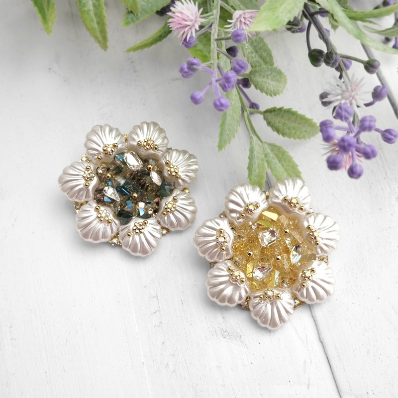 メレンゲや砂糖菓子のようなぽってりとしたシルエットが魅力のキラキラブローチ。甘めのデザインに落ち着いたカラーを組み合わせた、大人可愛いアイテムです。