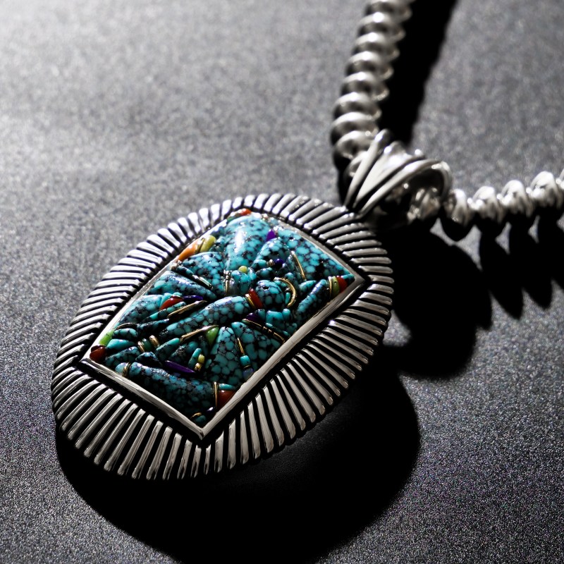 フレームは3.5mm厚の重厚シルバーの完璧なサンバースト仕立て、銀に美しい輝きを持たせるぷっくりとしたドーム状に。曲面にインレイをほどこすという高難度な技術もさることながら、インレイ部分をルーペでよく観察するとその緻密さ・繊細さにさらに心奪われる仕上がり、レイモンドヤジーが今まさに円熟期にあることを確信させてくれる素晴らしい逸品。バチカン部分トップには『聖なる4つの方角』を表すクロスが、裏を見るとネイティブアメリカンの護符・アローヘッド(やじり)の形になっているという仕込みも嬉しい。セットとなった鏡面ナバホパールビーズネックレスはいちからハンドメイドで妹のマリーヤジーが制作を手掛けたもの、最高級トップに相応しい最高品質のナバホパールネックレスとなっています。