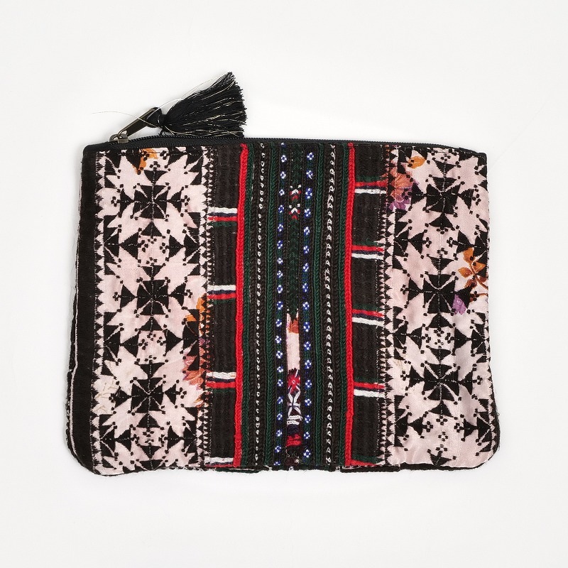 アフガニスタンの80~90年前のヴィンテージドレスの生地を使ったポーチ。ドレスの袖口の生地を使っており、華やかでエスニック感溢れる刺繍がポイント。フラットな大きめサイズで、ボールペンが横に入るサイズ感。色柄は全て異なる1点物。