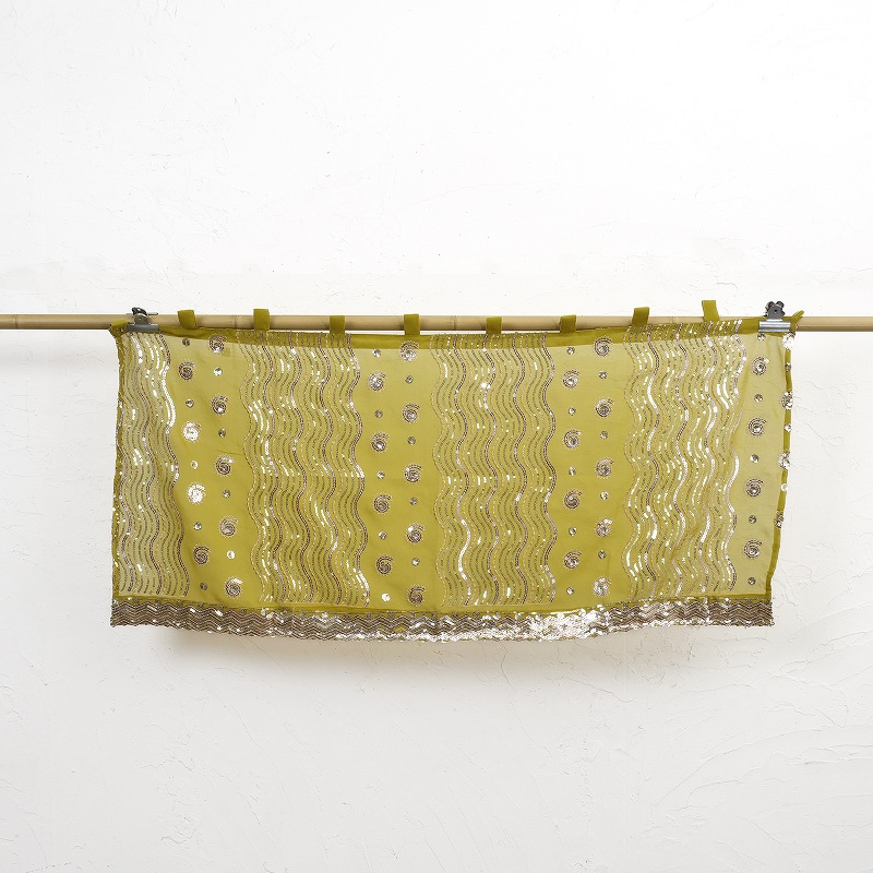 オールドのザリ刺繍サリーをアップサイクルしたカフェカーテン。美しい刺繍がお部屋をエキゾチックな雰囲気にしてくれる。インドではレッドやグリーンなどビビッドな色合いが人気で、パステルカラーなど淡い色合いはレアでなかなか手に入りにくいと言われています。ほつれや破れの出たサリーのまだ使える箇所や装飾部分を選んで材料にし、新しく生まれ変わらせた環境にやさしいカーテンです。透ける素材で目隠しやレースカーテンがわりに。色柄はひとつひとつ異なる1点もの、何枚も重ねてかけるのもゴージャス。