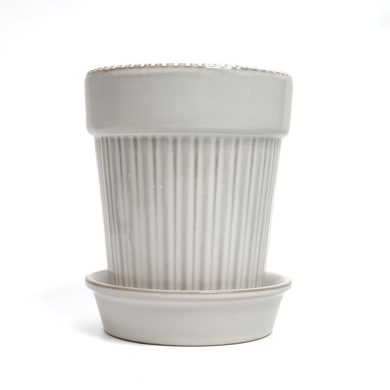使いやすいベーシックな形の植木鉢。ホワイトとブラックの2色展開。やや大きめなので、大きい植物でもフィットします。屋内でも汚れる心配のない受け皿付き。屋外使用でも色あせしにくい陶器製です。