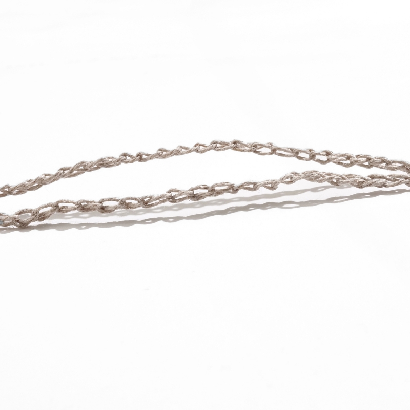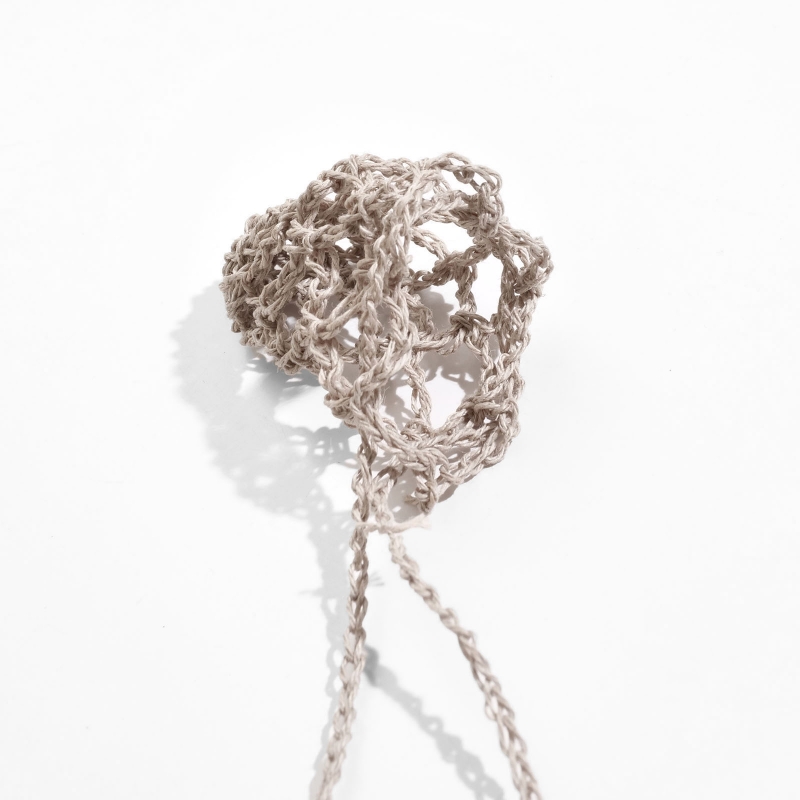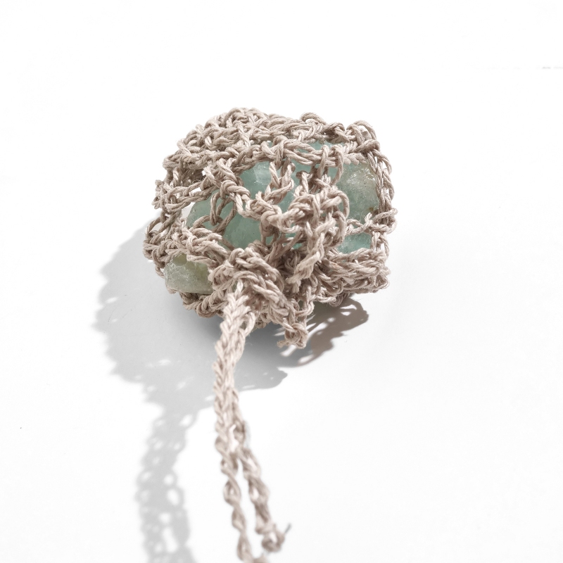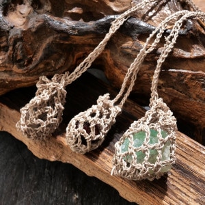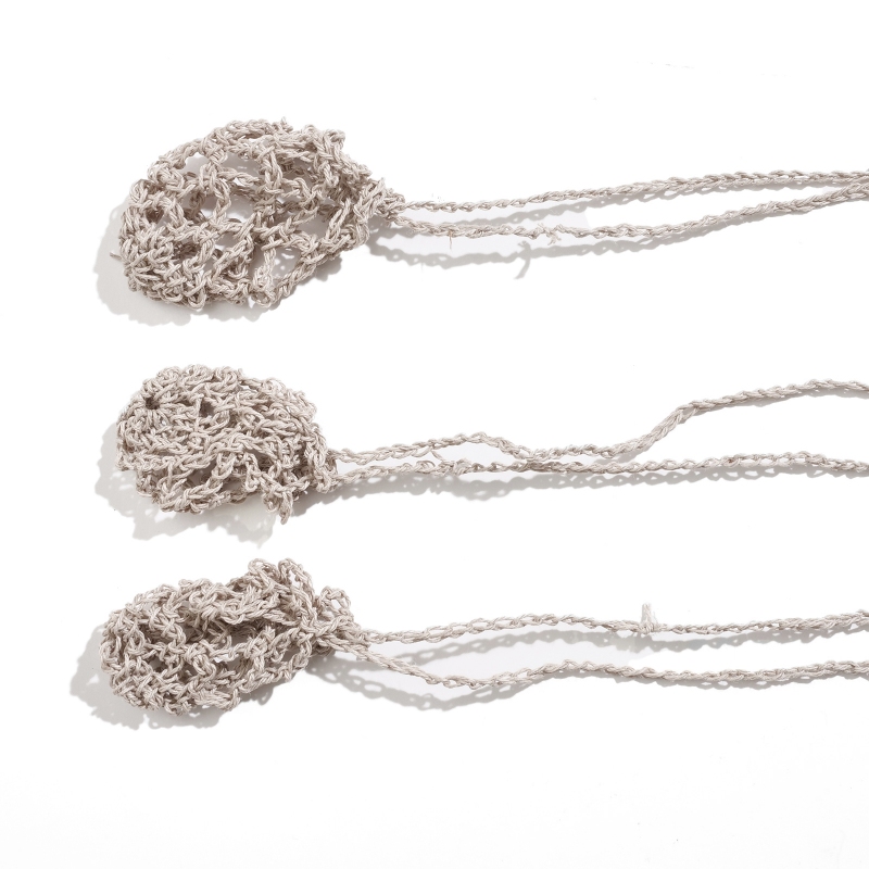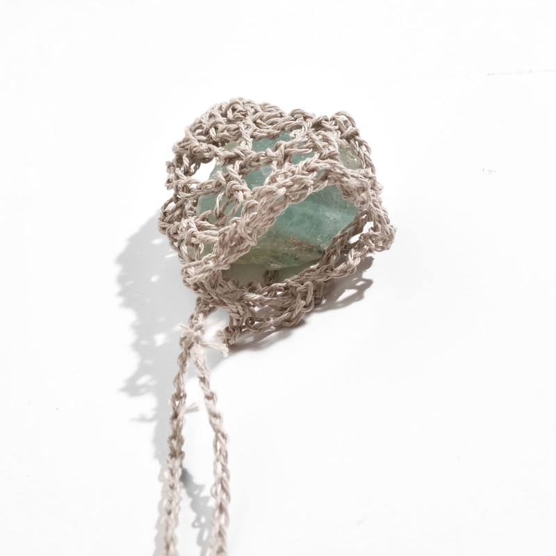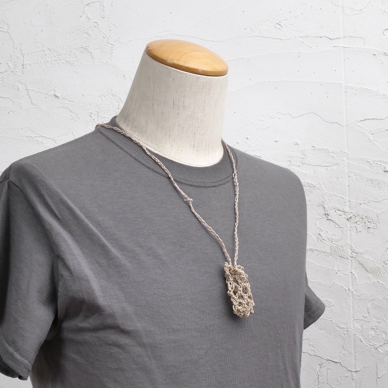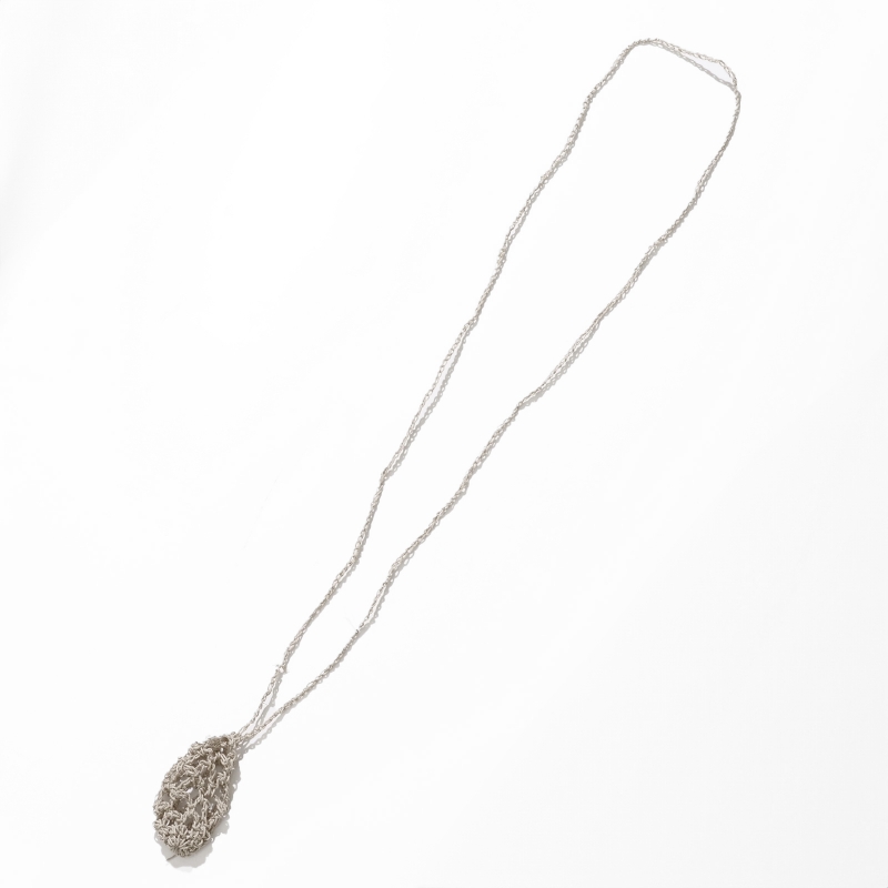 巾着のように開閉できる袋状のデザインが特徴で、お好みの天然石や小さなアイテムを包み込むことが出来ます。長さや編み目の風合いも個性があり、自然素材ならではの柔らかな質感が魅力。お守りやお気に入りの石を身につける特別なアクセサリーとしてお楽しみください。