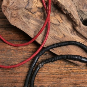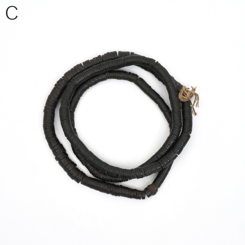 ケニア産のアンティークビーズ1連です。1900年代後半に作られたもので、ココナッツの殻や樹脂を素材にしたものが一般的。一部には古いレコード盤を再利用して作られたものもあり、その場合は『レコードビーズ』とも呼ばれます。凹凸のある表面が、素朴で味わい深い風合いを演出。そのまま飾るのはもちろん、パーツとしてアクセサリー制作にもご活用いただけます。