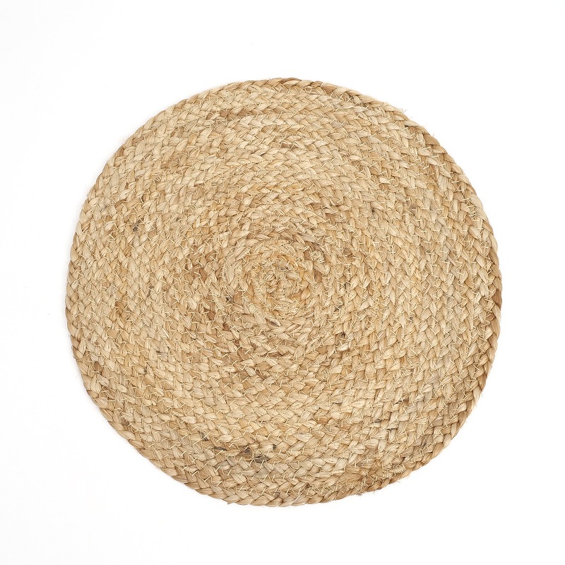 染色も脱色もしていないナチュラルなジュート繊維を使ったマットシリーズ。編んで紐状にしたジュートを丸く円を描くように縫い合わせて作ったプレースマットです。ナチュラルやエスニックなインテリアに合わせやすく、飽きのこないシンプルなデザインも魅力。観葉植物の敷物などキズや汚れの防止としても使用できます。