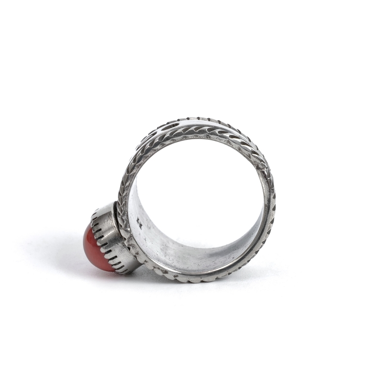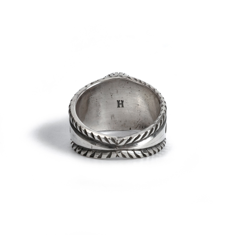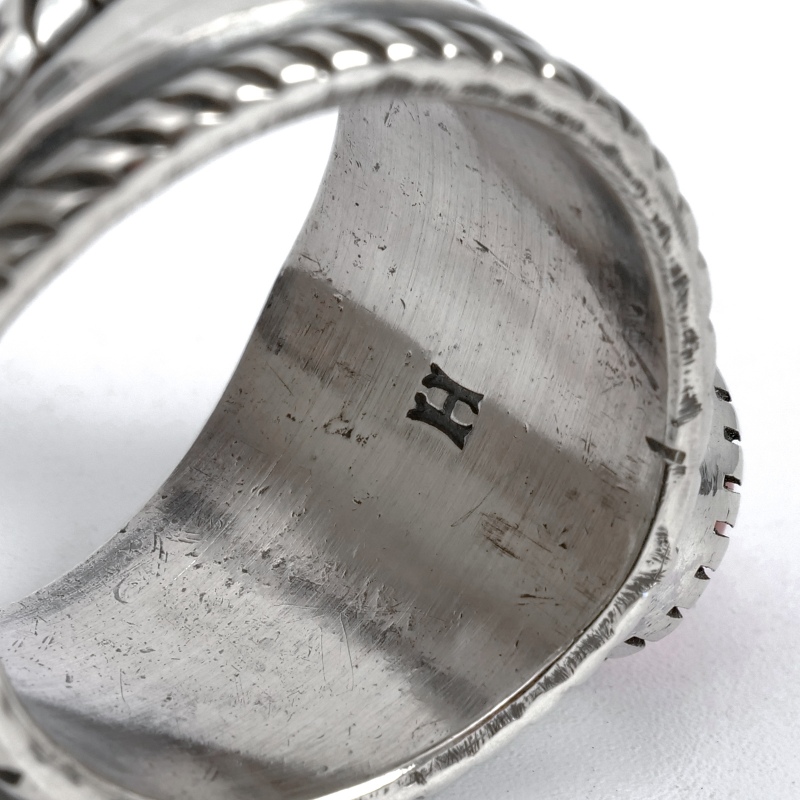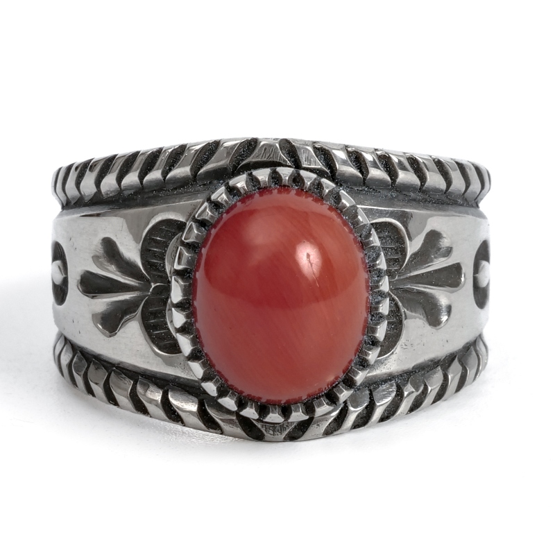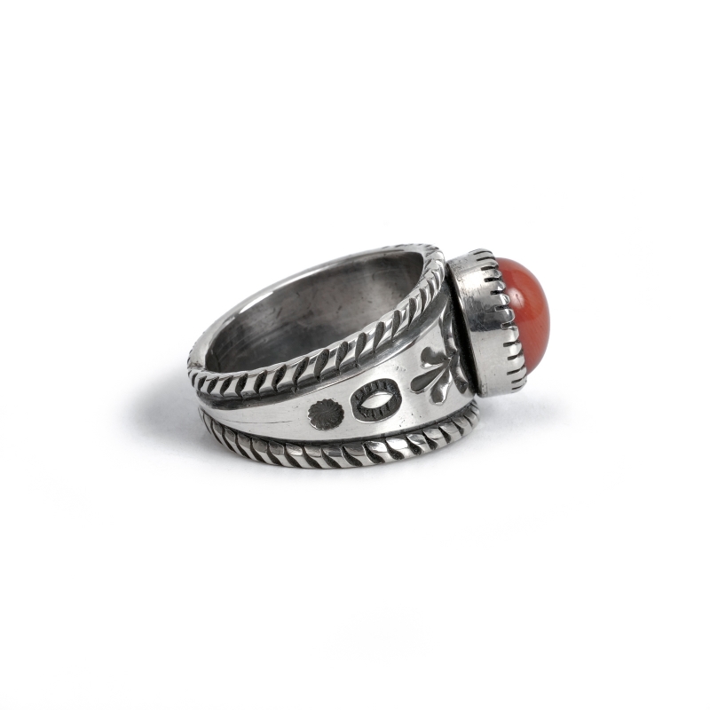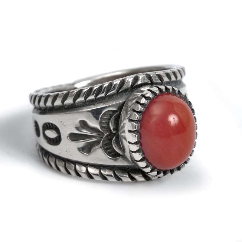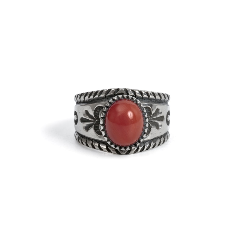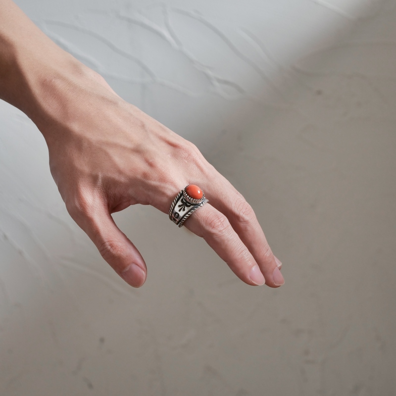 ハリソンジムのスタンプワークリングです。石を主役にスタンプワークを施し、後ろは細くなるようテーパーダウンされた人気のデザイン。ハンドメイドベゼルで囲まれた厚みのある朱赤イタリア産コーラルが印象的、インゴットの肉厚鏡面シルバーが高級感をプラス。気軽につけられる本格ジュエリーです。
