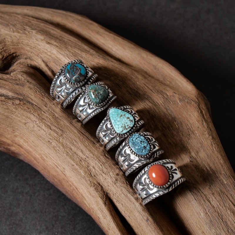 | ご注意 | ※ハンドクラフト特有のゆがみ・ずれ等がある為、表記サイズには多少の誤差がございます。 ※銀は経年で硫化する為、画像より黒ずみが増える、またはより綺麗に磨かれてのお届けとなる場合がございます。 ※インディアンジュエリーは伝統的な手仕事による製法上キズ・銀面のムラ・接合のラフさなどが多く見られるジュエリーです。味わいのうちとしてお楽しみください。 |