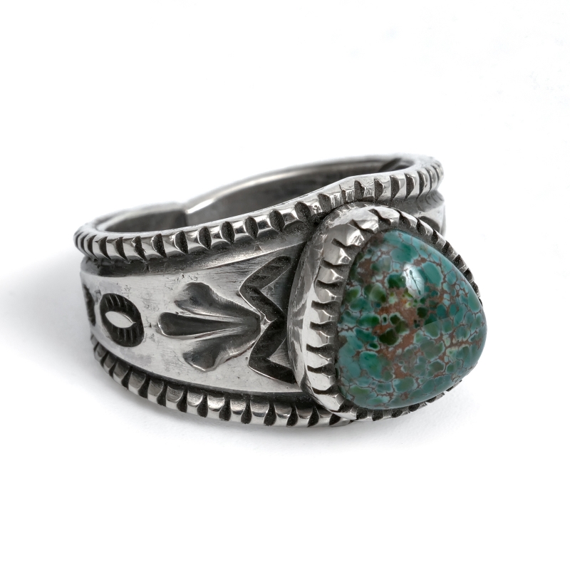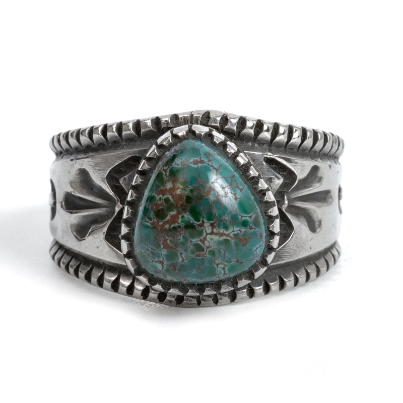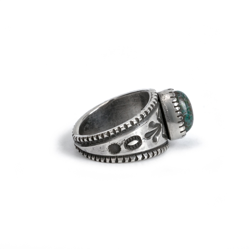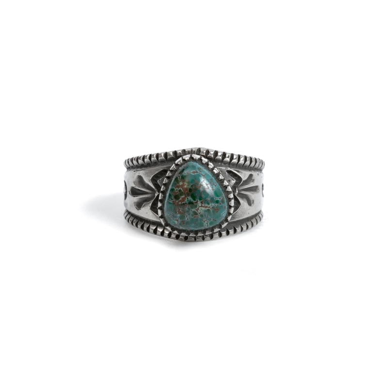ハリソンジムのスタンプワークリングです。石を主役にスタンプワークを施し、後ろは細くなるようテーパーダウンされた人気のデザイン。ハンドメイドベゼルで囲まれているのは、深海のような深いグリーンのレアカラーロイストンターコイズ、インゴットの肉厚鏡面シルバーが高級感をプラス。気軽につけられる本格ジュエリーです。