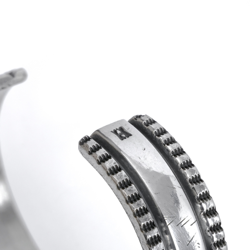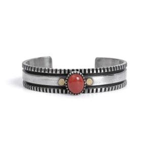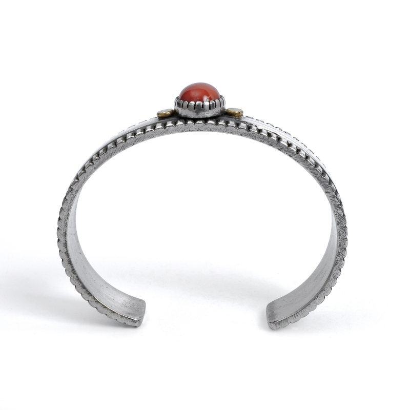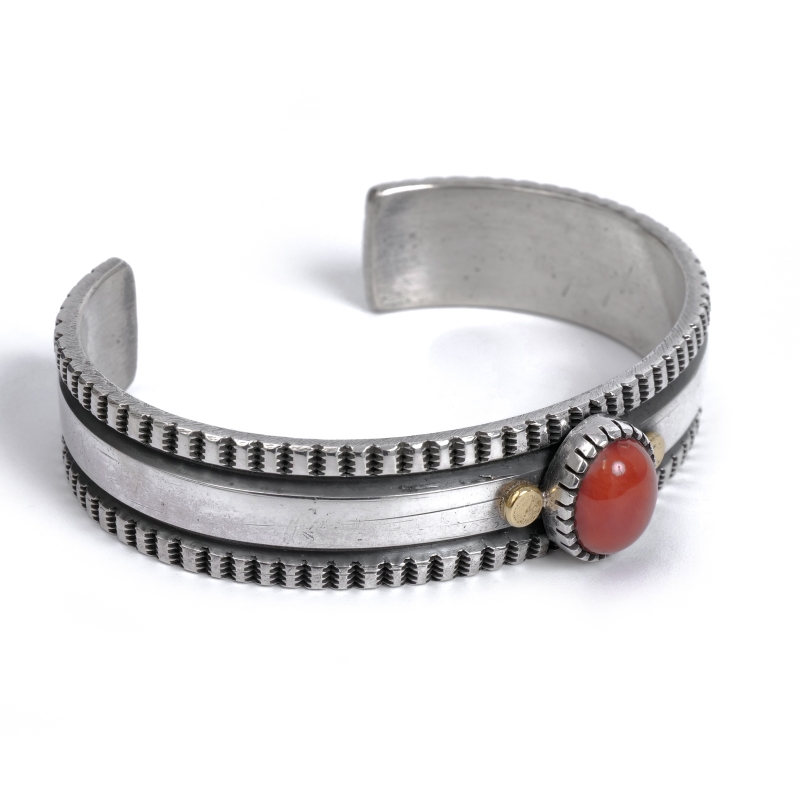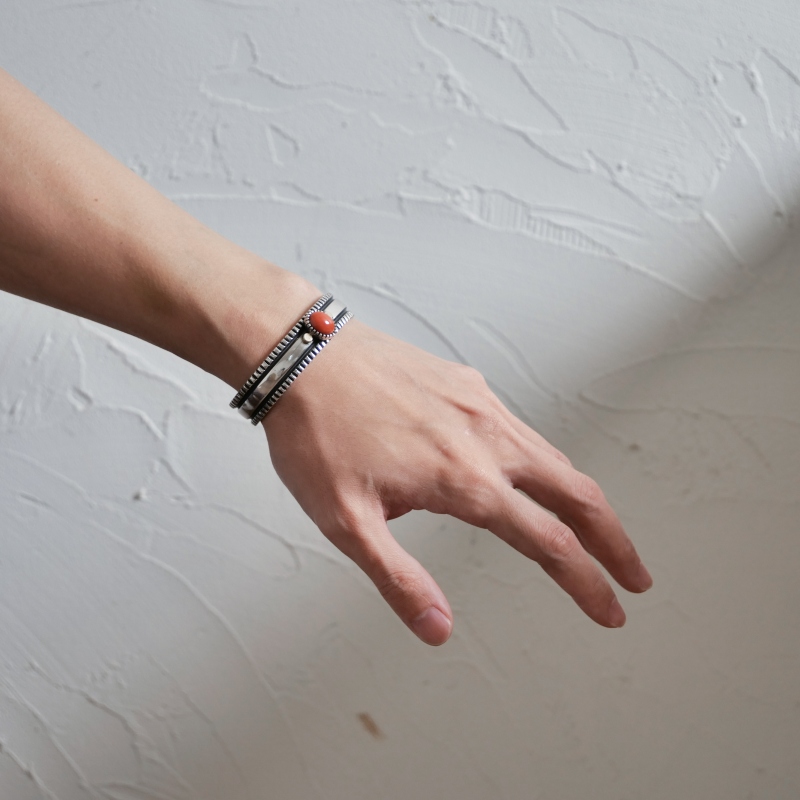 ハリソンジムのスタンプワークバングルです。ちらりとゴールドをあしらった別注モデル。トップには明るい朱赤のイタリアンコーラルがハンドメイドベゼルで留められ、両サイドにフラットな18金ドロップを配し華やかさをプラス。ナバホジュエリーでよく見るドロップではなく上部をフラットにしているのがカジュアルで粋。アームは溶かした銀を鋳造し鍛えたインゴットシルバーを使用、鏡面に磨き上げ、エッジには繊細な刻みの入ったスタンプをエンドまで等間隔に打ち込んでいます。エンドに入ったホールマーク”H”も雰囲気あり。伝統工芸に現代ジュエリーのエッセンスを加えた、ハリソンジムらしいハイセンスな仕上がりとなっています