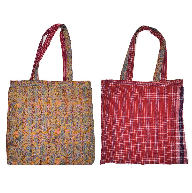 グドゥリー生地とチェック柄のガムシャ生地を組み合わせたリバーシブルトート