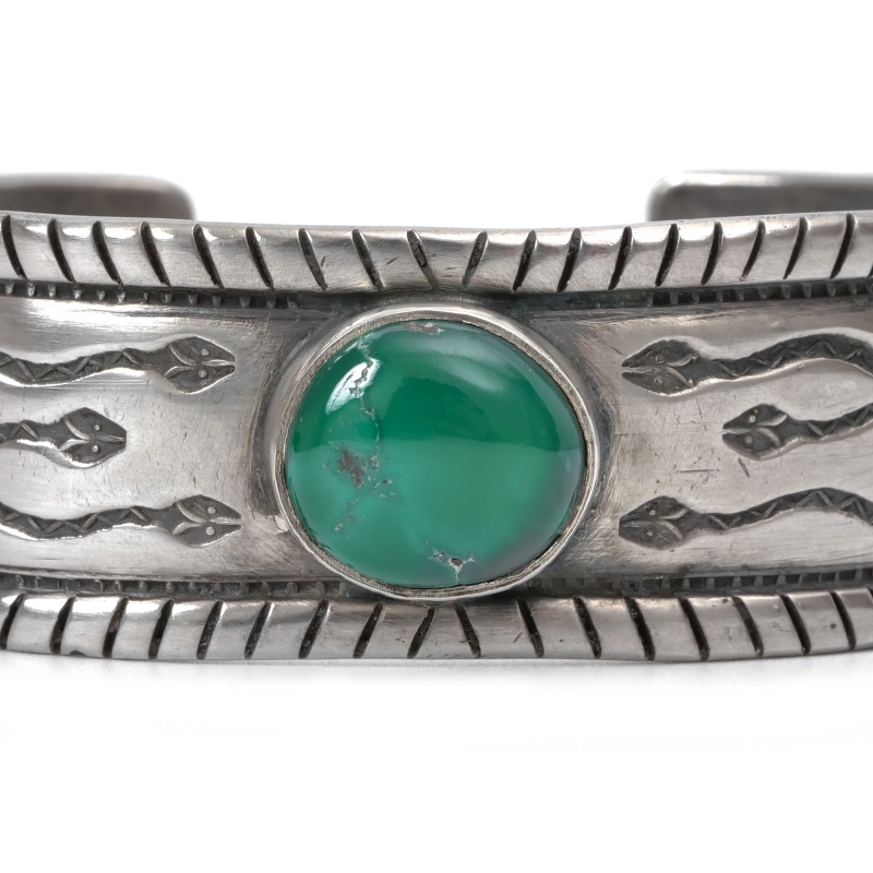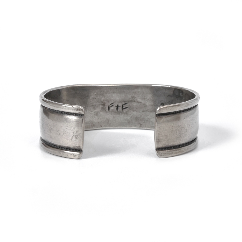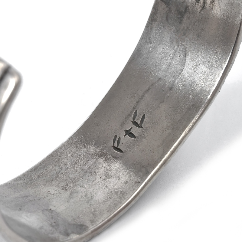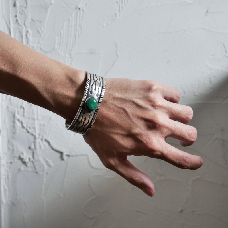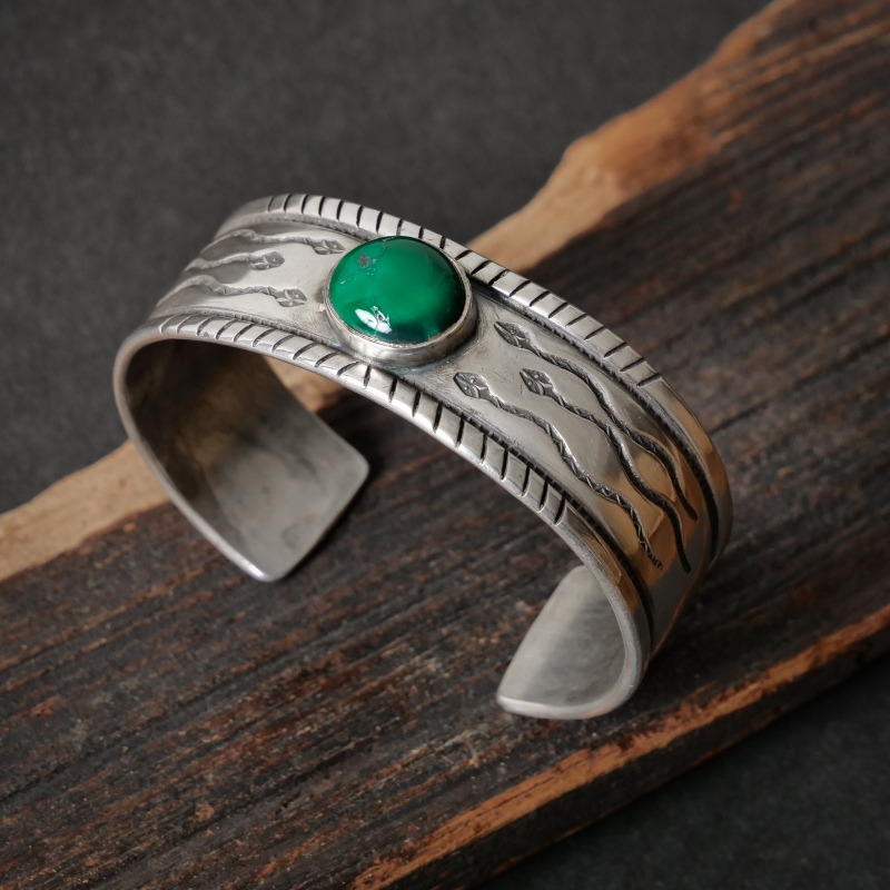 ファルコントレーディングのフォックスバングルです。銀と銅を溶かしてコインシルバーと同じ90.0純度にした銀のインゴットから仕立てた、すっきりした薄手の中幅バングルです。中心には透明感のあるヴィリジアングリーンのフォックスターコイズ、その美しさに惹かれたかのように集まってきているのは古いスタンプで打ち込まれたスネーク(蛇)のモチーフ。ズニ族などでは蛇は死と再生を司るものとされ、ヴィンテージジュエリーではよく使用される人気のモチーフでした。100年前の雰囲気をそのままに復刻したような、ヴィンテージファンの心をくすぐる作品です。