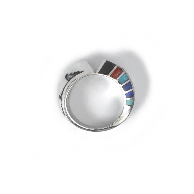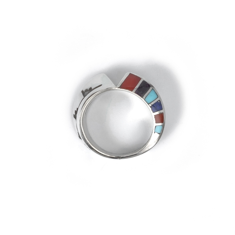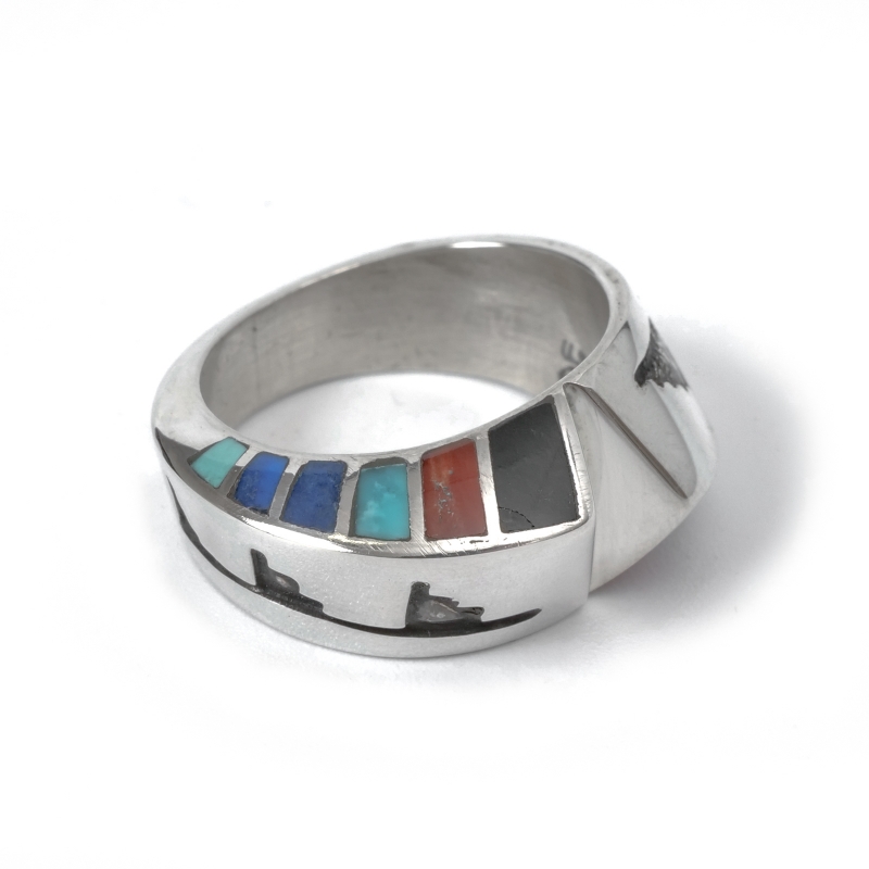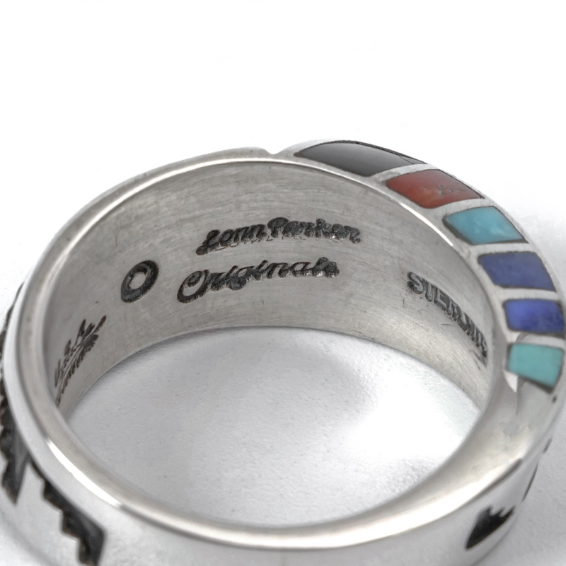 ロンパーカーの立体的なインレイ×オーバーレイのリングです。スギライトやラピスラズリ、コーラルやジェットをスリーピングビューティーターコイズと共にあしらったマルチストーンインレイは、その正確な象嵌で高級感ある仕上がり。雲を表すオーバーレイのモノクロームが鏡面シルバーを引き締めています。中空ボックス仕立てでボリュームのわりに軽い着け心地、細身ながらコーディネートの主役になる人気のジュエリーです。