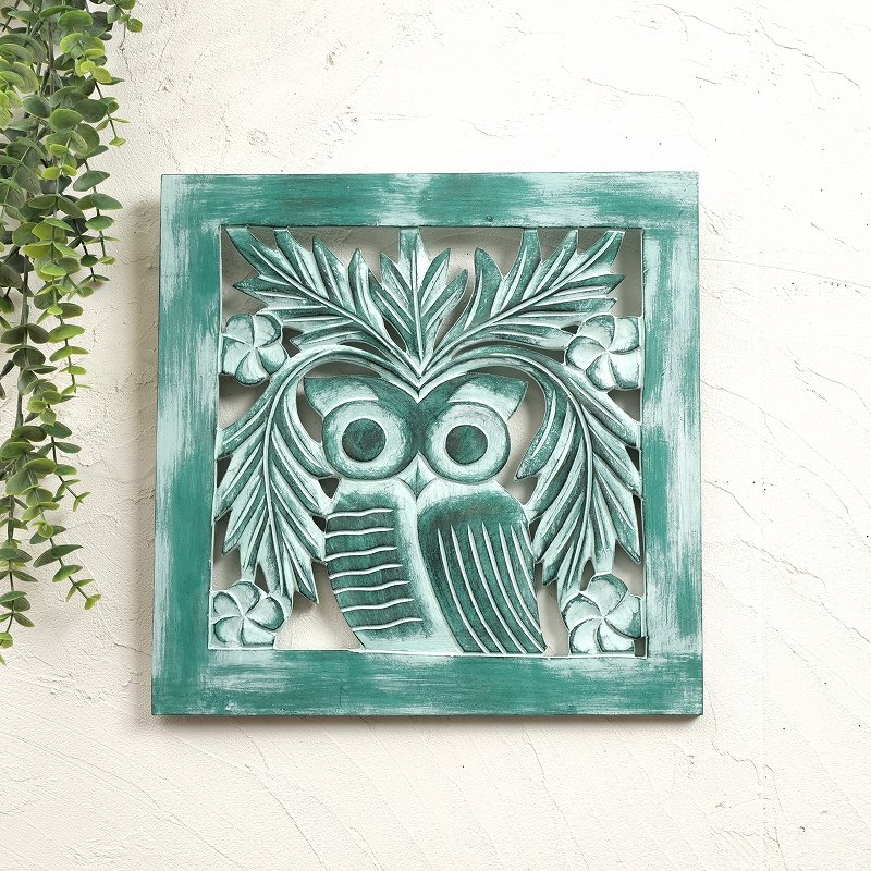 フクロウがヤシの葉とプルメリアに囲まれたトロピカルな雰囲気いっぱいの壁飾りです。アンティーク調のグリーン仕上げで、かすれのある風合いが特徴。シャビーシックな加工が施されており、ナチュラルで落ち着いた雰囲気。リビングや玄関、寝室の壁に。