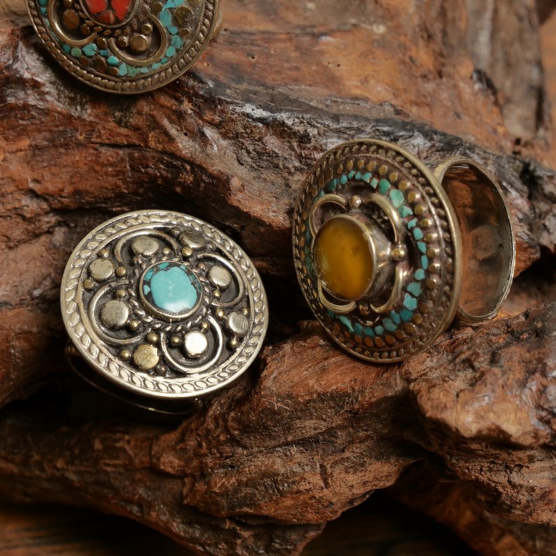 古代の中国と西洋を結び多くの絹が運ばれた交易路、「シルクロード」の影響を受けて発展したシルクロードアクセサリー。 伝統的なチベットの装身具にルーツを持つ、美しい色彩が特徴。落ち着いたデザインは上品な大人のエスニックスタイルに。インパクトのある大きなサークルの中にびっしりとストーンが埋め込まれた豪華なデザイン。ひとつ指に付けるだけで華やかに。