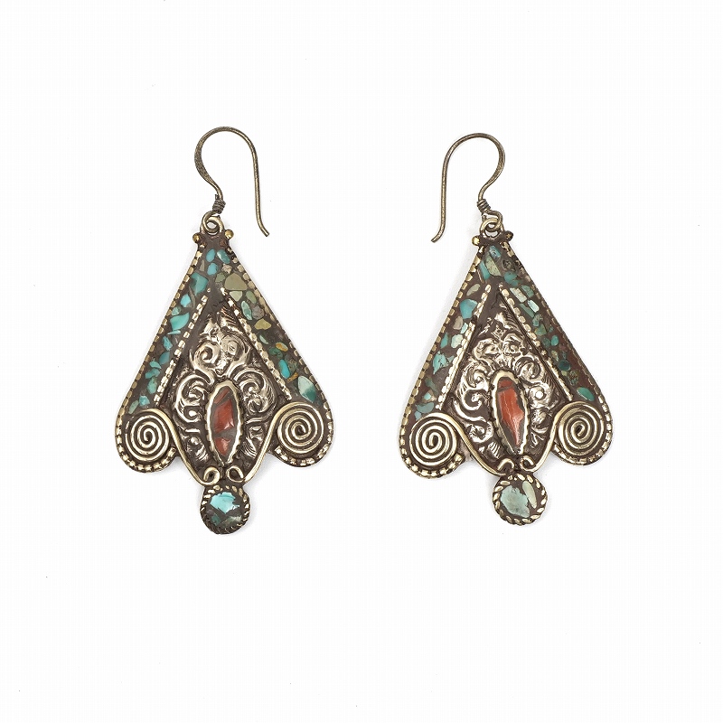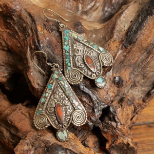 ネパールに伝わるシルクロードスタイルのアクセサリーです。ターコイズやコーラル、またはそれに類する色石は伝統的なチベットの装身具にルーツを持ち、デザインにはイスラームやムガールの文化を融合させ、文化の中継点であるネパールで花開いたスタイルのジュエリー。まさにシルクロードの文化が溶けあったジュエリーです。