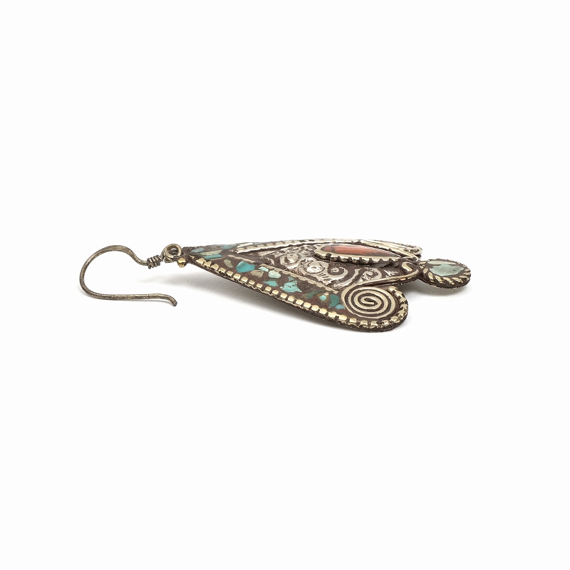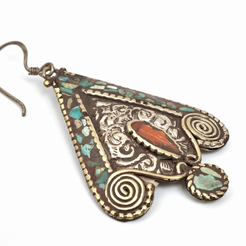 古代の中国と西洋を結び多くの絹が運ばれた交易路、「シルクロード」の影響を受けて発展したシルクロードアクセサリー。 伝統的なチベットの装身具にルーツを持つ、美しい色彩が特徴。落ち着いたデザインは上品な大人のエスニックスタイルに。三角形と渦巻模様が個性的なピアス。三角の形はモダンですっきりとした印象を与え、エスニックコーデに限らず、普段の着こなしにも合わせやすい。