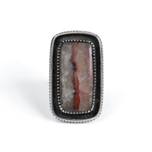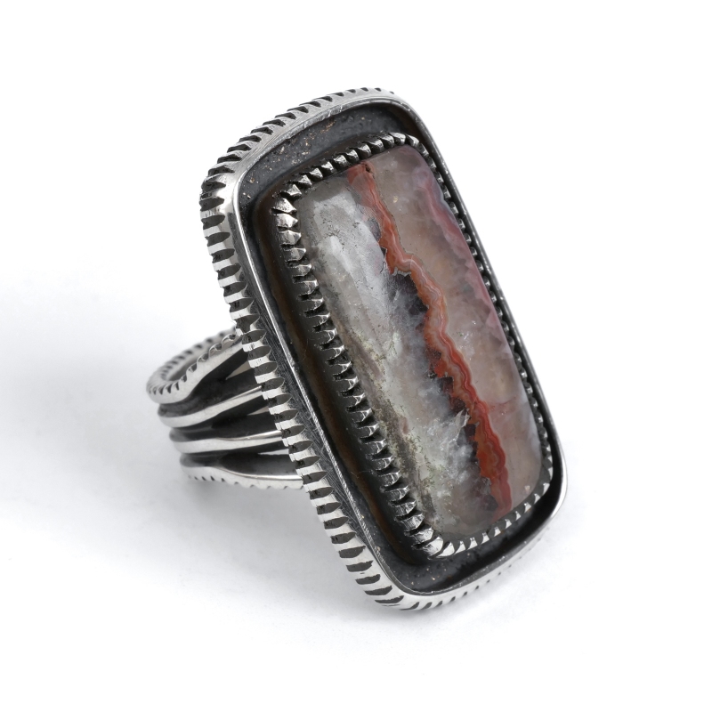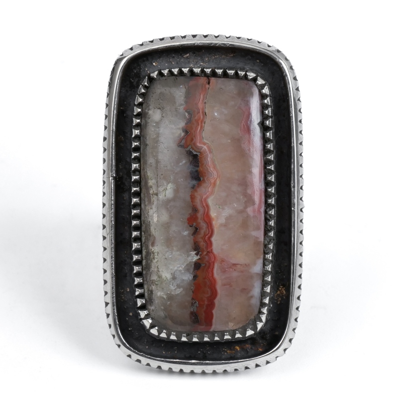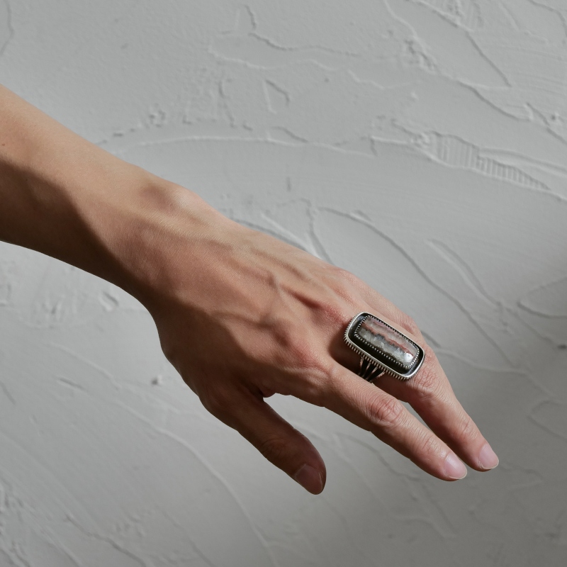 ハリソンジムのストーンリングです。マライカの仕入れルートで入手した希少天然石で特注した作品。トップはその模様の美しさを楽しむ「ピクチャーアゲート」。アゲートは瑪瑙。水晶と同じ石英の集合体ですが、石の形成過程で透明や不透明のカラフルな層などユニークな模様を生み出します。様々に入り組みまるで絵画のような面白さを楽しめるものがピクチャーアゲート、こちらは半透明の層に走る赤茶のラインがユニークな1点です。フレームもシャンクも銀を溶かすところから形作られたインゴットシルバー、丁寧にファイリングで刻んだコインエッジ仕立て。コインエッジに呼応するようなハンドメイドベゼルも石の個性を引き出し高級感を生み出しています。大人の色気を感じるワンランク上のストーンジュエリー、まさにワンオブアカインドな逸品です。