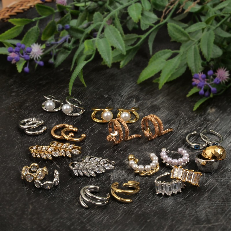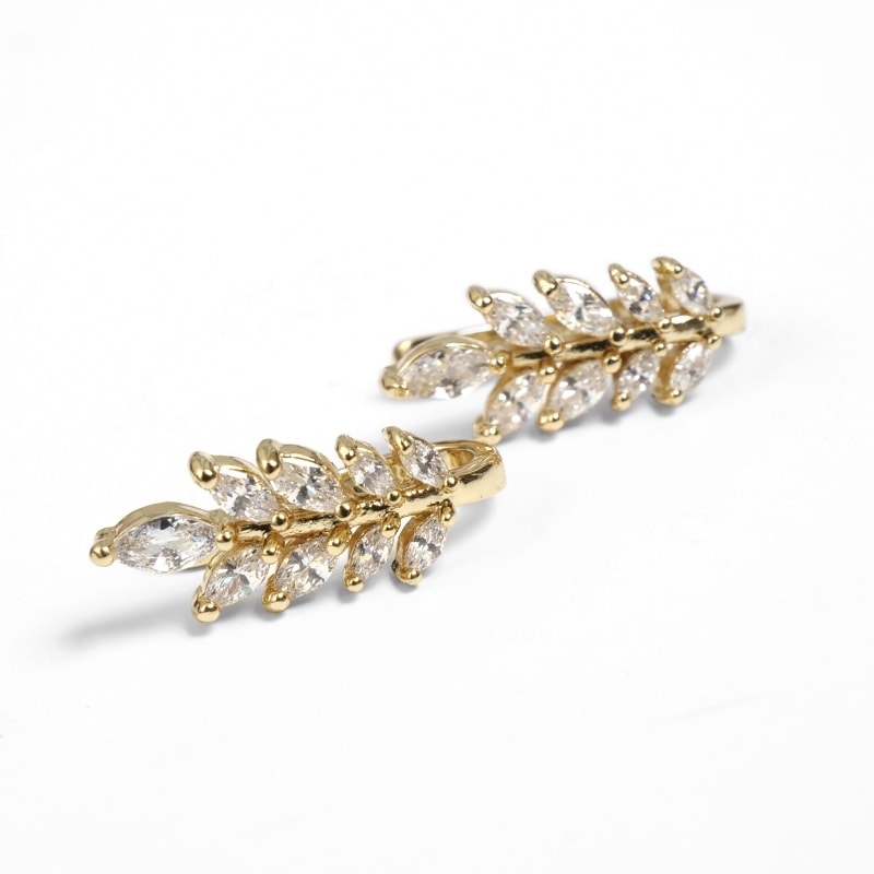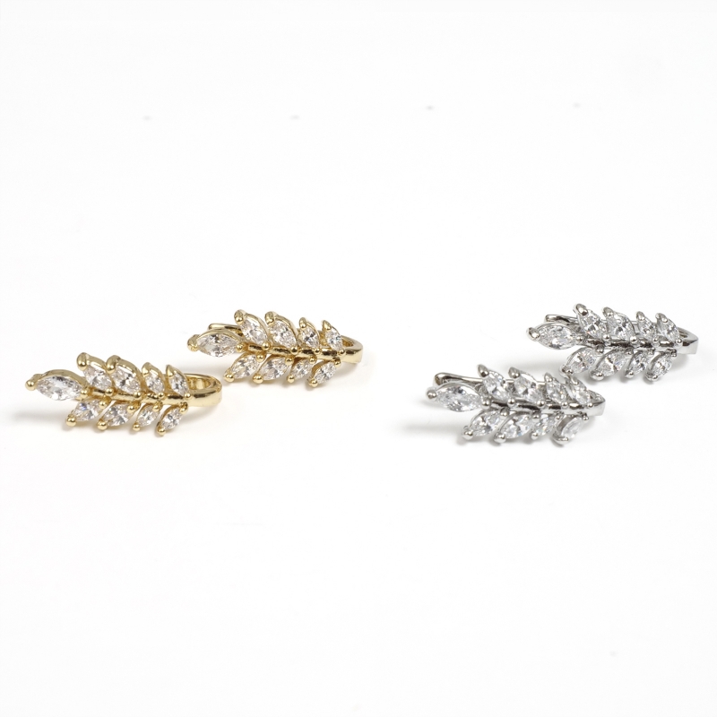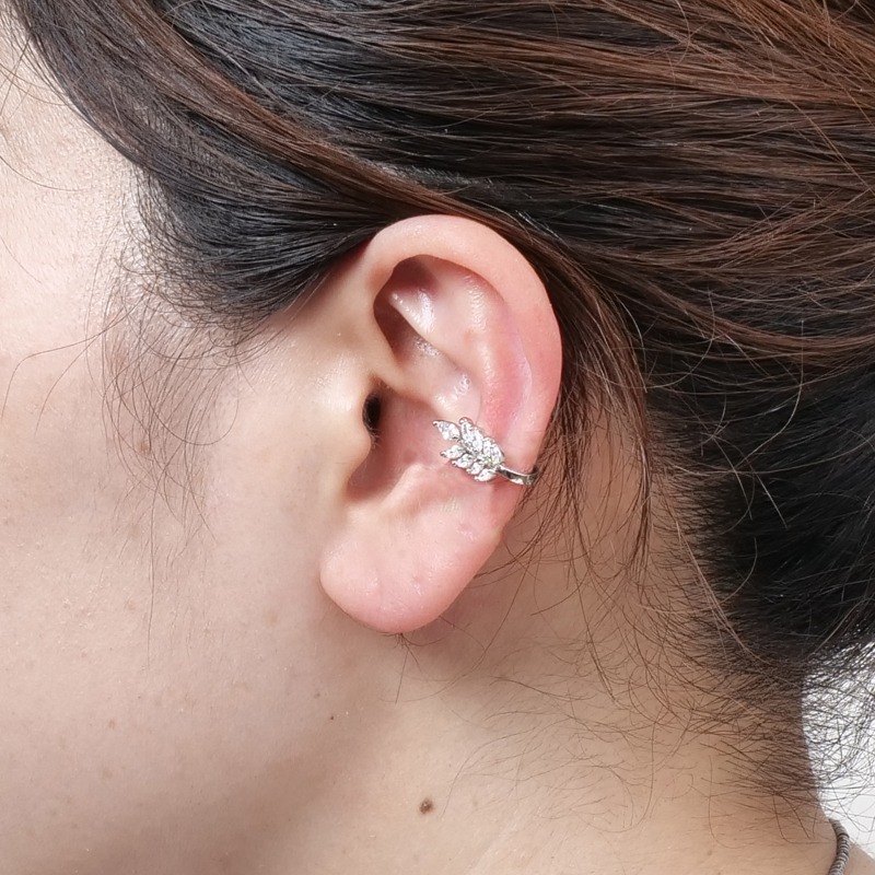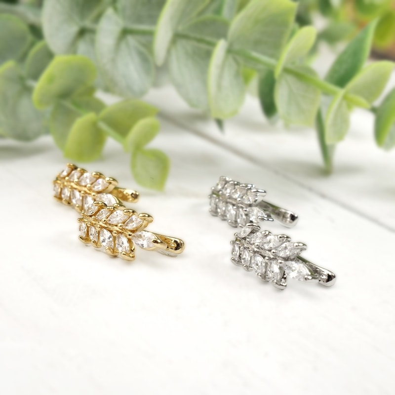 イヤーカフは、ピアスのように穴を開けずに楽しめるイヤーアクセサリー。こちらは両耳にシンメトリーに付けられるデザイン。キラキラの葉が優しい雰囲気、ナチュラルコーデのアクセントに。