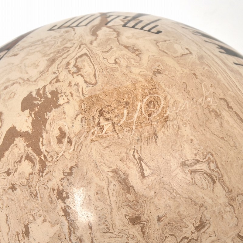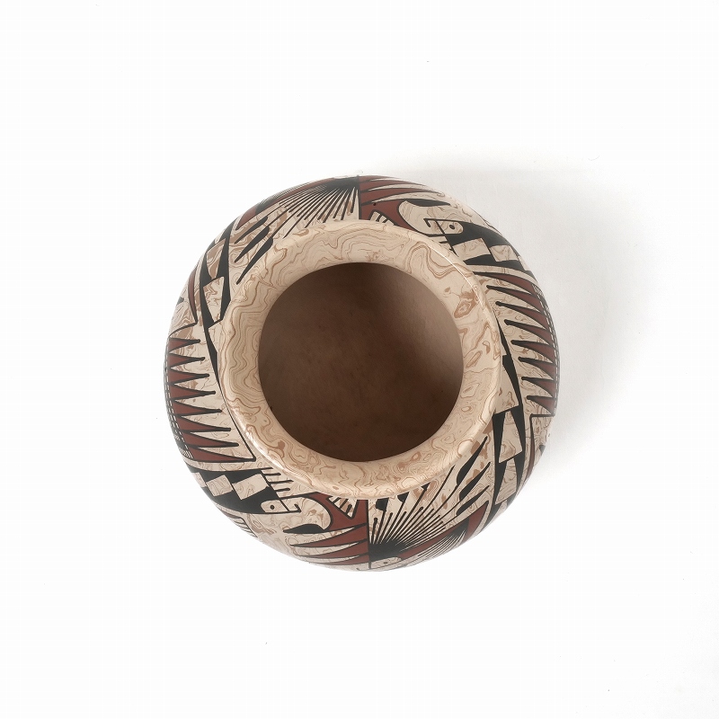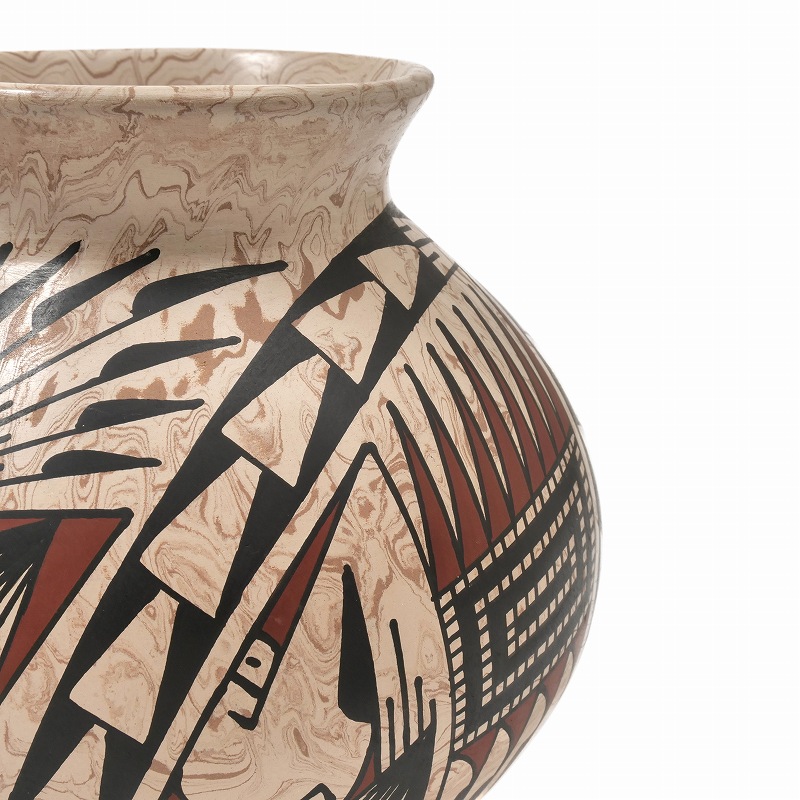 マーブル模様の上に伝統的な幾何学模様が施されたデザイン。作者Oscar QuezadaはMata ortiz potteryの創始者であるフアンの甥。Juanより陶芸の教えを受けた母コンソラシオンより、陶芸を学びました。伝統的なパキメ様式の絵付けで装飾した作品を得意としています。