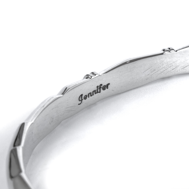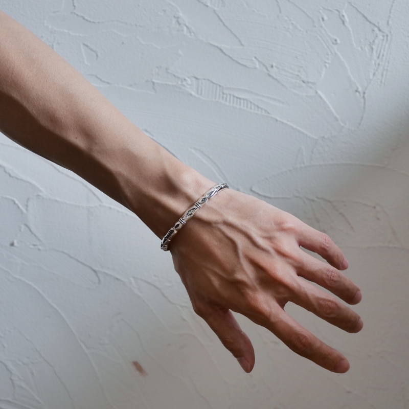 ジェニファーカーティスのスタンプワークバングルです。鏡面ハーフラウンド(半円)ワイヤーに父譲りのディープスタンプを打ち込み、細かいファイリング(やすり掛け)で立体感をプラスした高級感ある1点。丸みを帯びたトップで落ち着きがありつつ、ジェニファーらしい深いスタンプがエッジイさもプラスしています。単体で着けても重ねづけしても絵になり、デザインがすべて異なる1点もの。ギフトやペアジュリーにも相応しい1点。