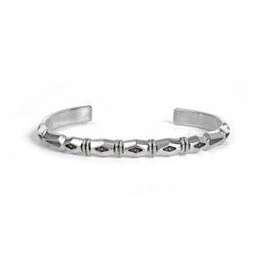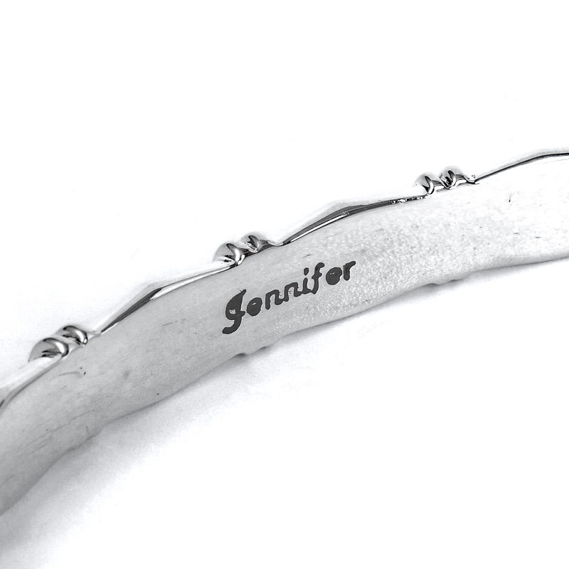 ジェニファーカーティスのスタンプワークバングルです。鏡面ハーフラウンド(半円)ワイヤーに父譲りのディープスタンプを打ち込み、細かいファイリング(やすり掛け)で立体感をプラスした高級感ある1点。丸みを帯びたトップで落ち着きがありつつ、ジェニファーらしい深いスタンプがエッジイさもプラスしています。単体で着けても重ねづけしても絵になり、デザインがすべて異なる1点もの。ギフトやペアジュリーにも相応しい1点。