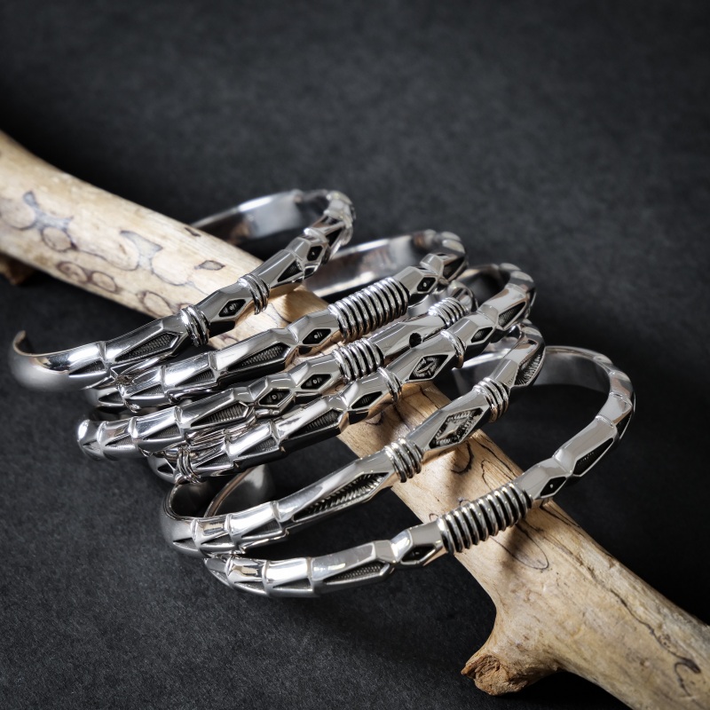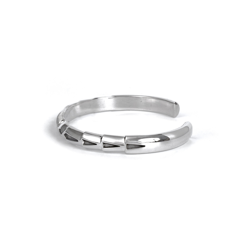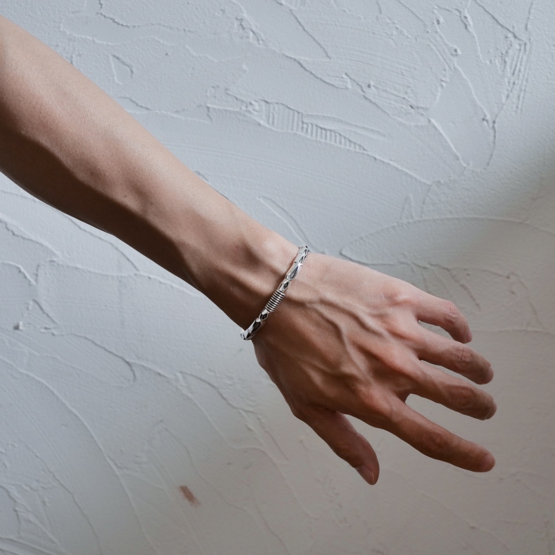ジェニファーカーティスのスタンプワークバングルです。鏡面ハーフラウンド(半円)ワイヤーに父譲りのディープスタンプを打ち込み、細かいファイリング(やすり掛け)で立体感をプラスした高級感ある1点。丸みを帯びたトップで落ち着きがありつつ、ジェニファーらしい深いスタンプがエッジイさもプラスしています。単体で着けても重ねづけしても絵になり、デザインがすべて異なる1点もの。ギフトやペアジュリーにも相応しい1点。